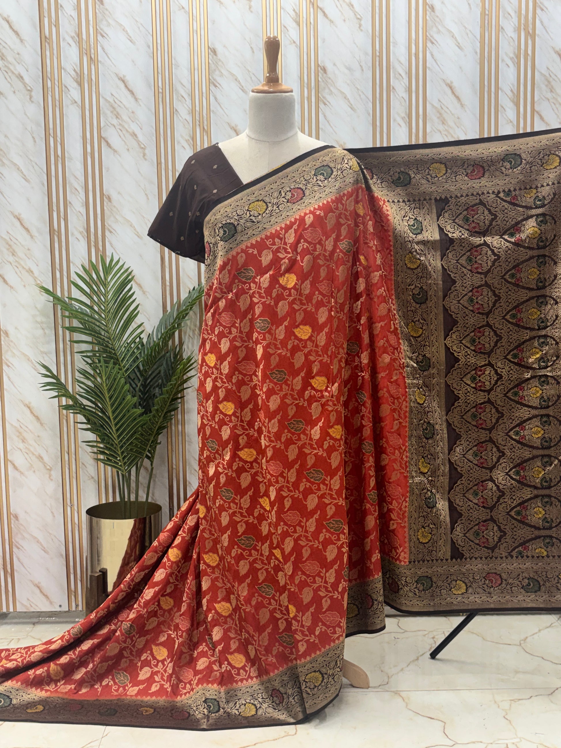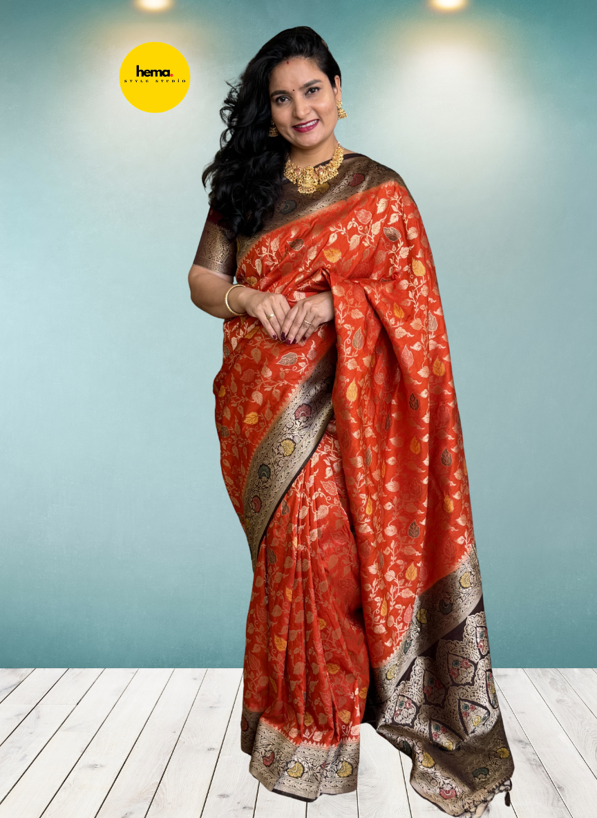 Product Description: The trending Banarasi Dola saree showcases a Meenakari woven leaf jal pattern with golden zari work across the body, complemented by a grand pallu and a floral Banarasi border.