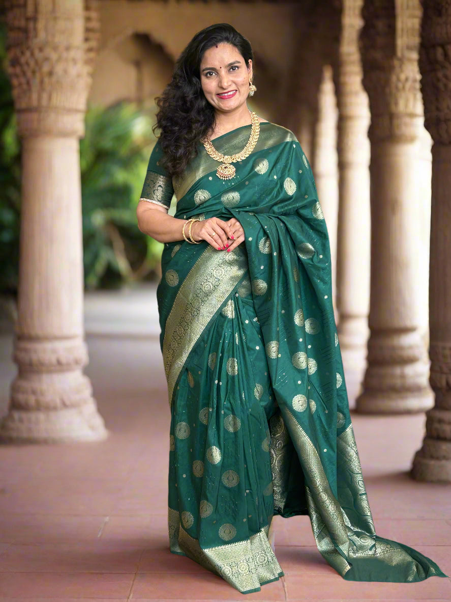 Product Description: Banarasi Khaddi Georgette with elegant round motifs and sequence work perfectly spaced throughout the body, unique and rich big border, and ultra-rich pallu.