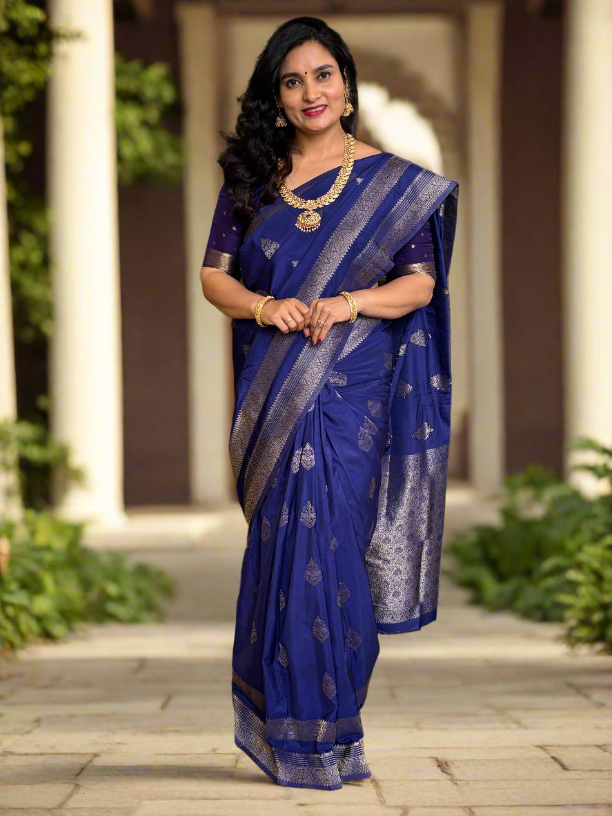 Product Description: Discover our stunning Banarasi Khaddi Georgette saree, showcasing beautiful leaf motifs throughout the body. It features a beautiful golden jari bentex border. The unique aspect of this saree is its rich pallu. Additionally, the blouse is embellished with a running border and motifs, adding an elegant touch.