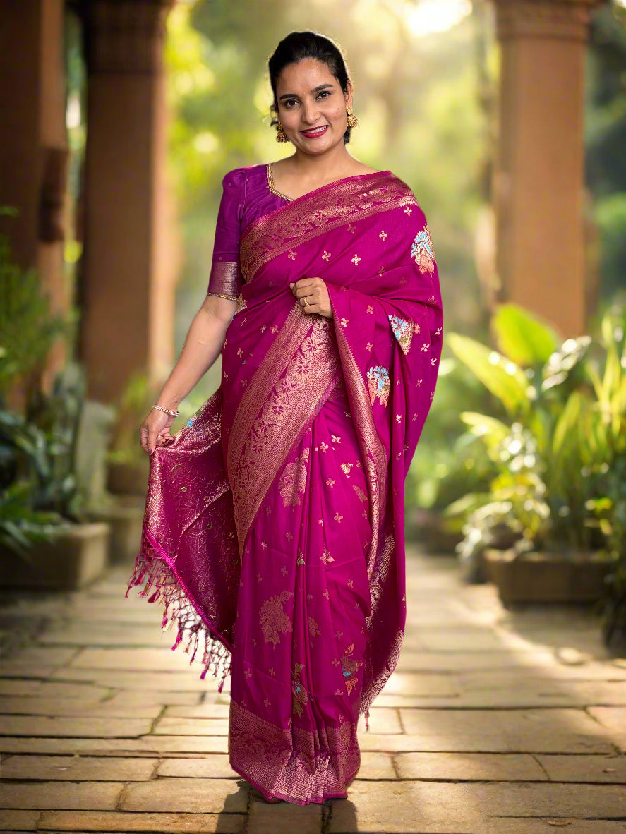 Product Description: Banarasi Georgette Crepe with elegant floral 3D meenakari motifs perfectly spaced throughout the body, unique and rich border, and ultrarich pallu with tassels. Perfect for wedding receptions, functions, and traditional parties. This saree is a must-have for any saree lover.