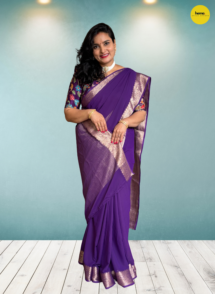 Product Description: Georgette Chiffon is renowned for its softness and excellent draping quality, making it effortless to carry. This saree is available in trending self-colors. It has ivory zari border and a graceful chit pallu, adding a touch of elegance.
