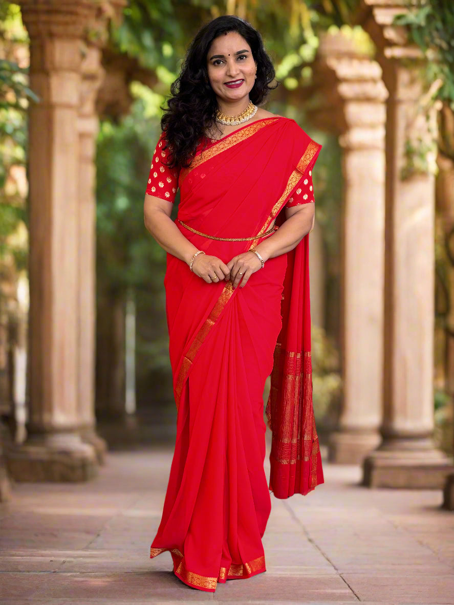 Product Description: Crushed chiffon in self colours. The saree features 1 inch golden jari floral design border, beautiful crushed design chit pallu and running blouse.