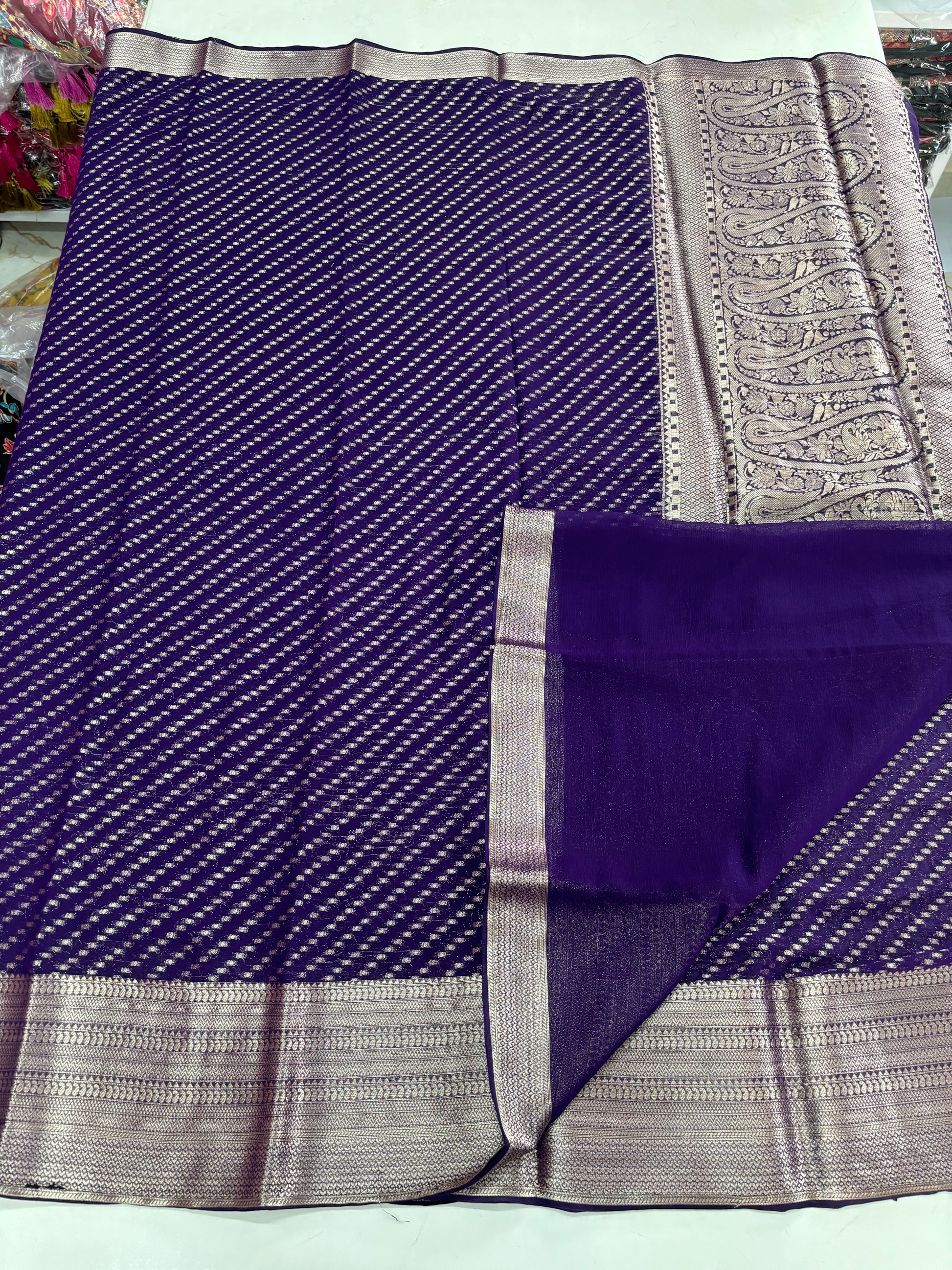 Georgette Chiffon (Self, Dotted Diagonal Lines and Rich Mango Pallu)