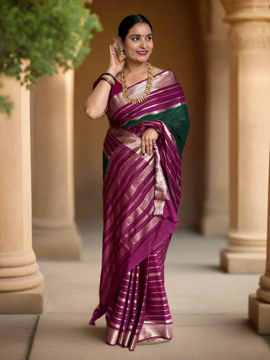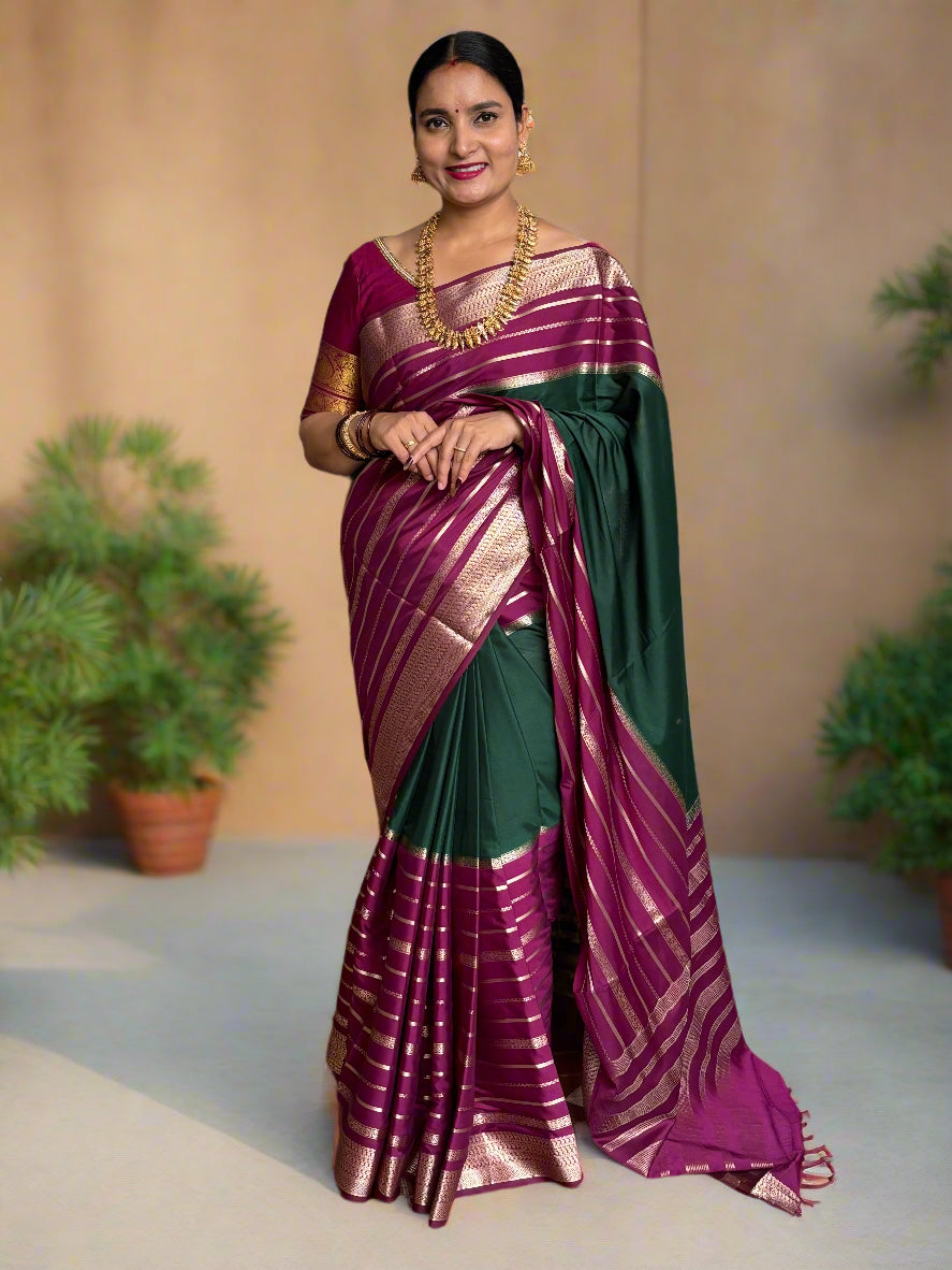 Product Description: Semi Mysore crepe made from premium fabric features gold zari horizontal lines on both sides and a plain center, with a three-line mango border.