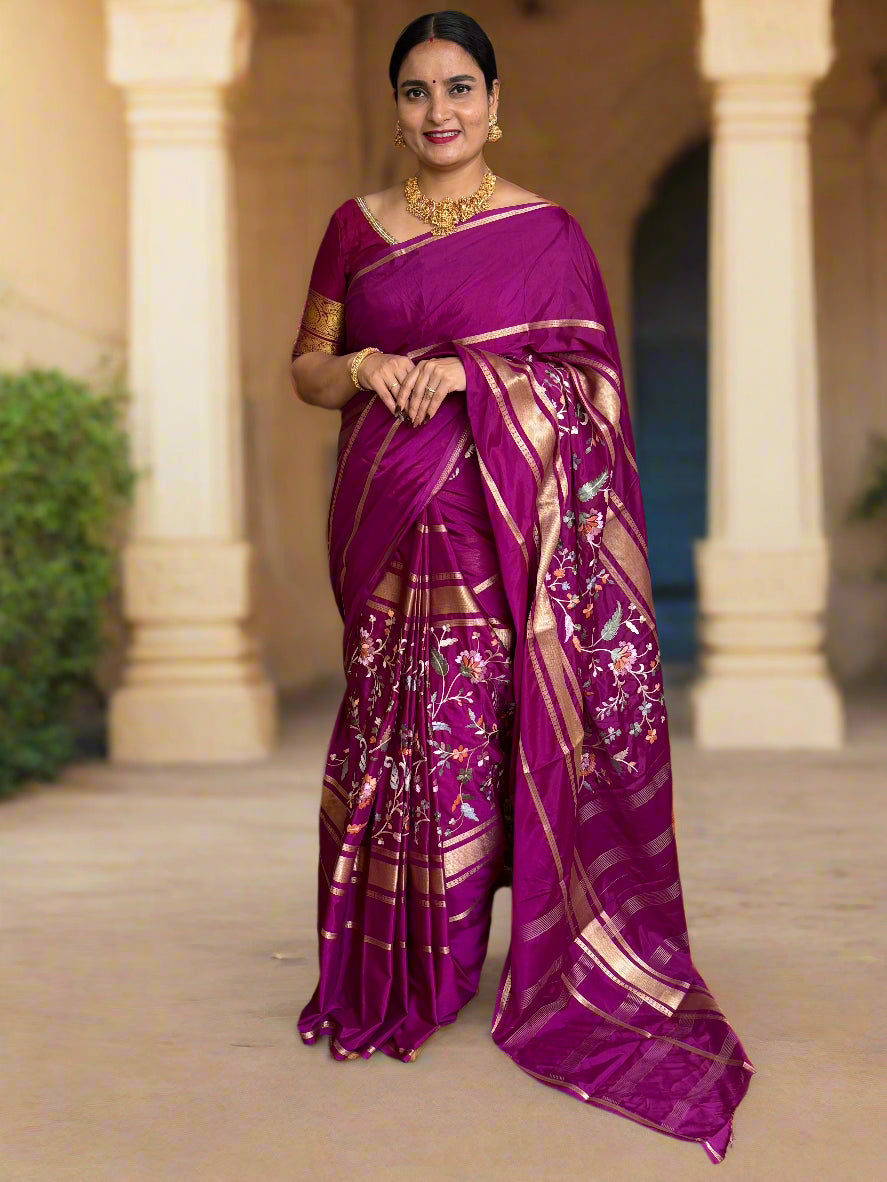 Product Description: The Semi Mysore Crepe saree features beautiful floral embroidery on its body. It has a plain body complemented by creative embroidery work and a trendy four-line border woven in premium zari. This saree comes with a blouse made from plain fabric with a running border.