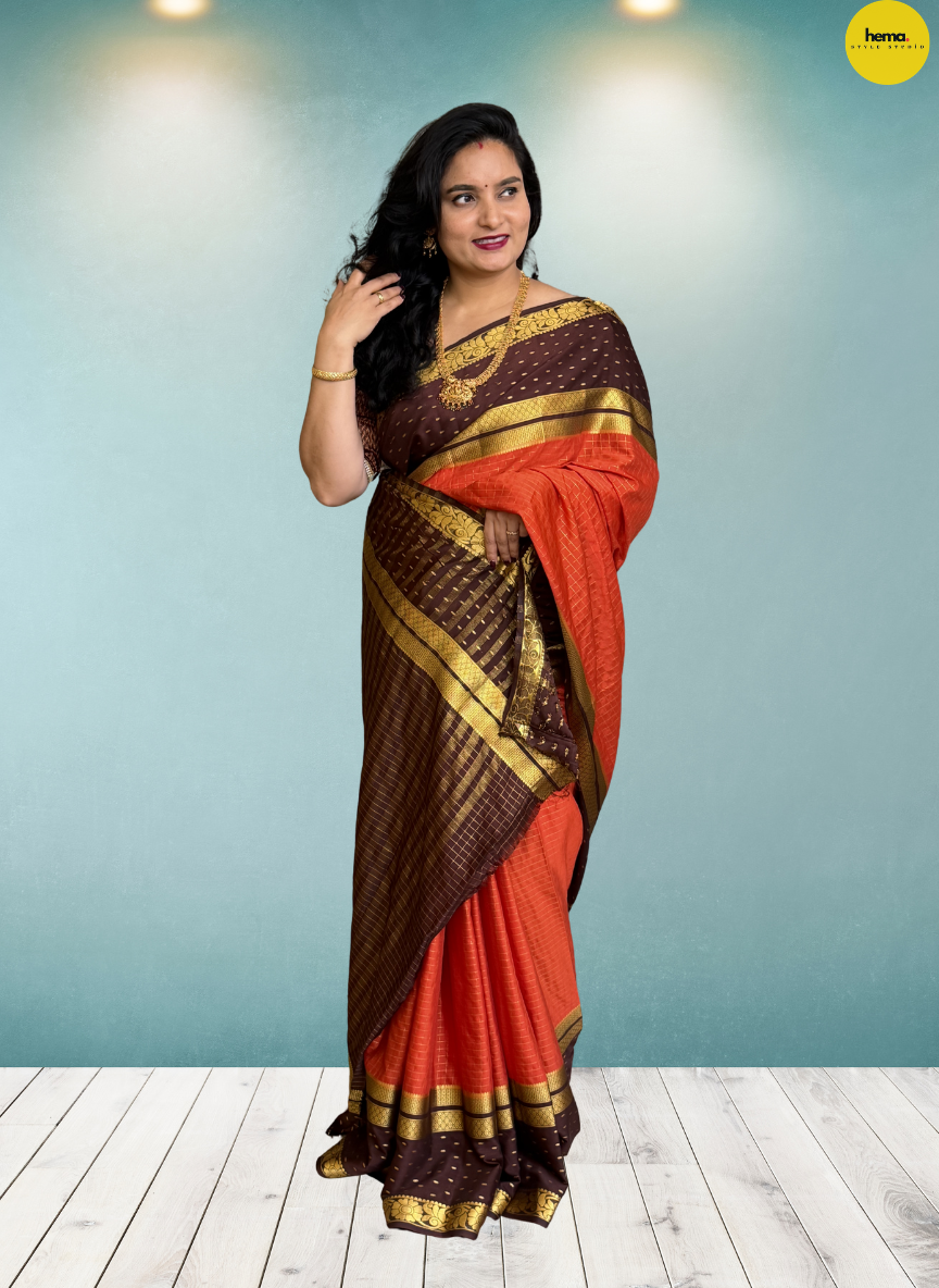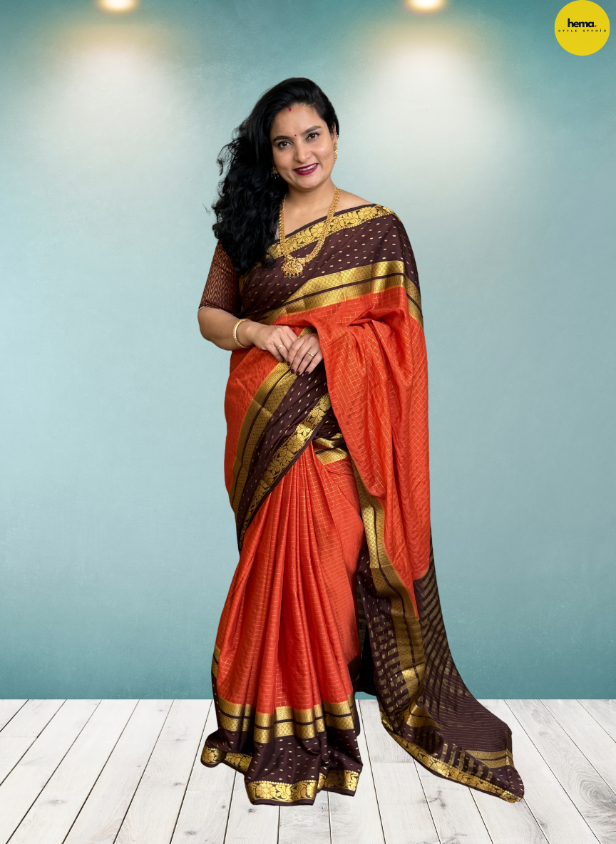 Product Description: This Semi-Mysore crepe saree has a smooth checked body that exudes effortless elegance. It features large raindrops with a floral bentex border in a 2D pattern, complemented by a golden zari border, adding the perfect touch of tradition and style.