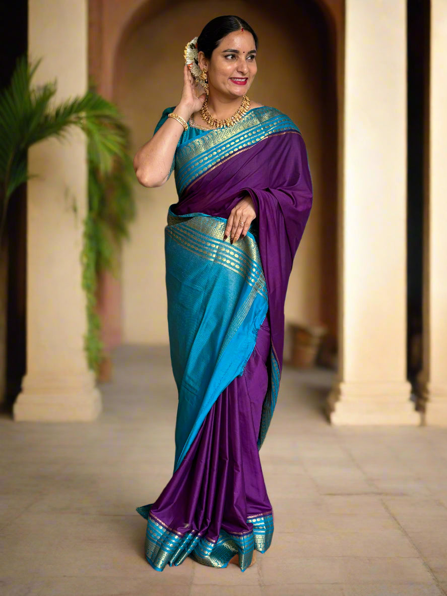 Product Description: This semi-Mysore crepe saree features a stunning border woven with a golden zari design of mangoes and dots. The saree is dyed in trendy contrasting color combinations and includes a cute chit pallu. The blouse is in a plain contrasting color and has a running border.