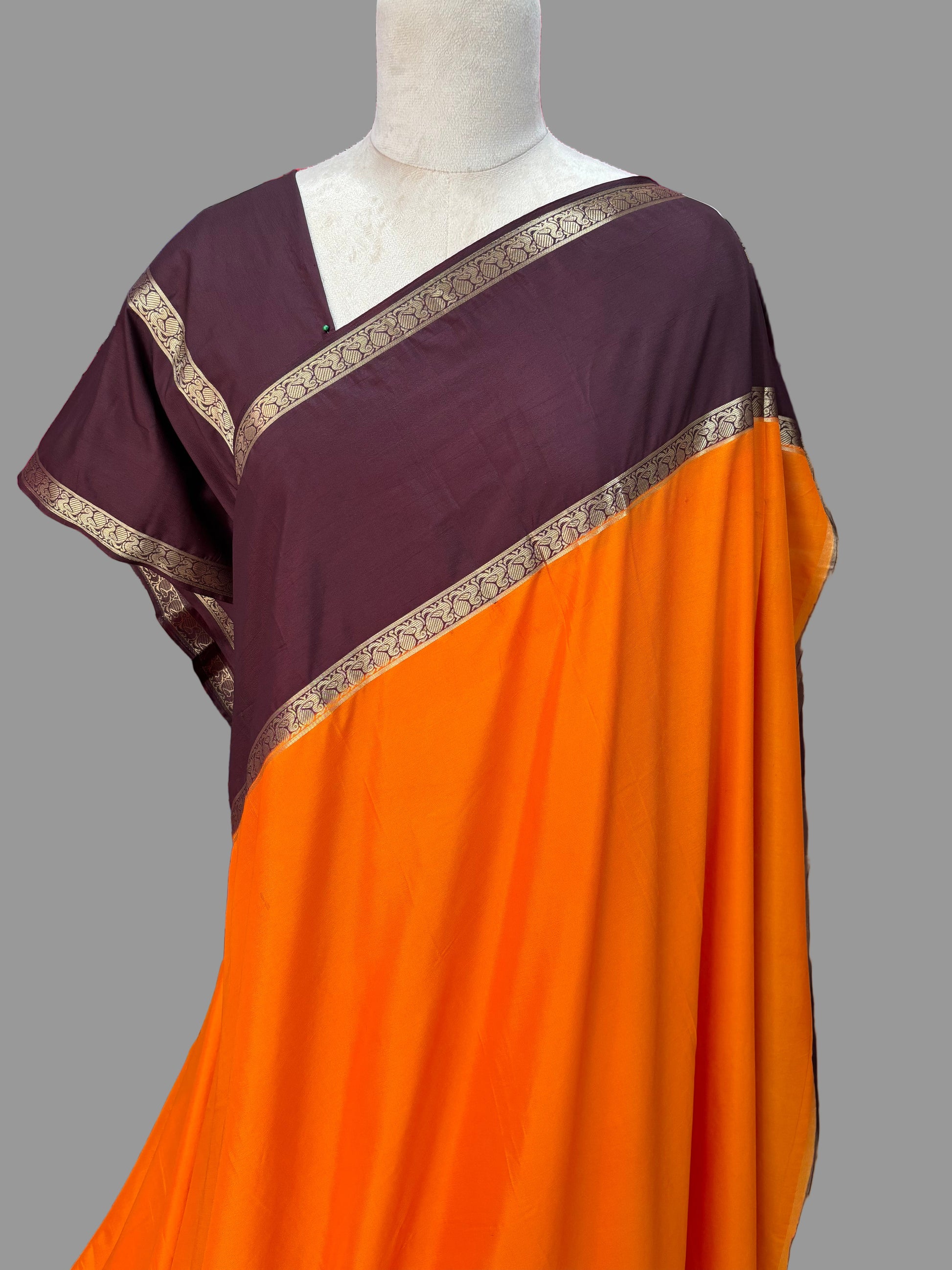 Product Description: Semi Mysore Crepe in premium fabric. It features piping bentex border equal size on both the sides.