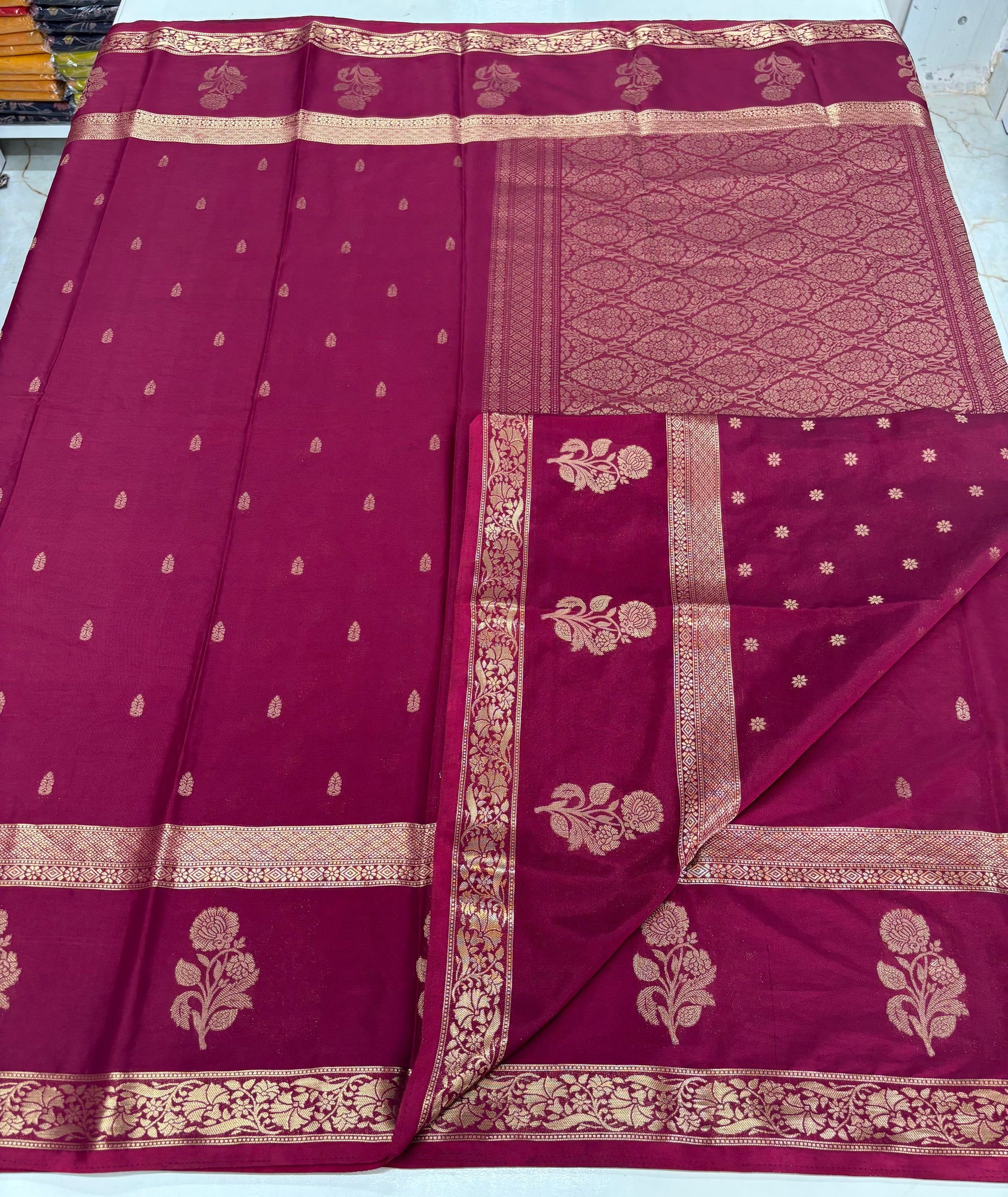 Product Description: The Premium Semi Mysore Crepe saree showcases a bentex border adorned with floral motifs between the borders and a rich pallu woven with golden zari. The saree features charming motifs spread evenly across its body, giving it a perfectly elegant look. It comes with a blouse showcasing matching motifs and a running border, perfectly complementing the saree's design.