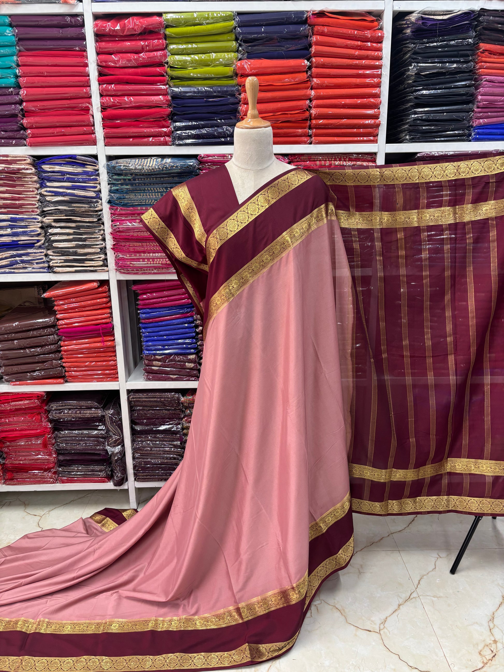 Product Description: Semi Mysore Crepe in premium fabric. It features trending floral bentex border weaved using premium zari.