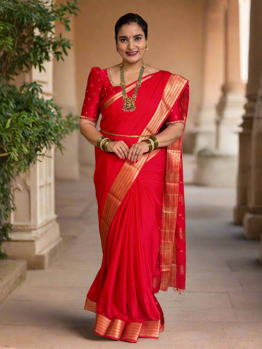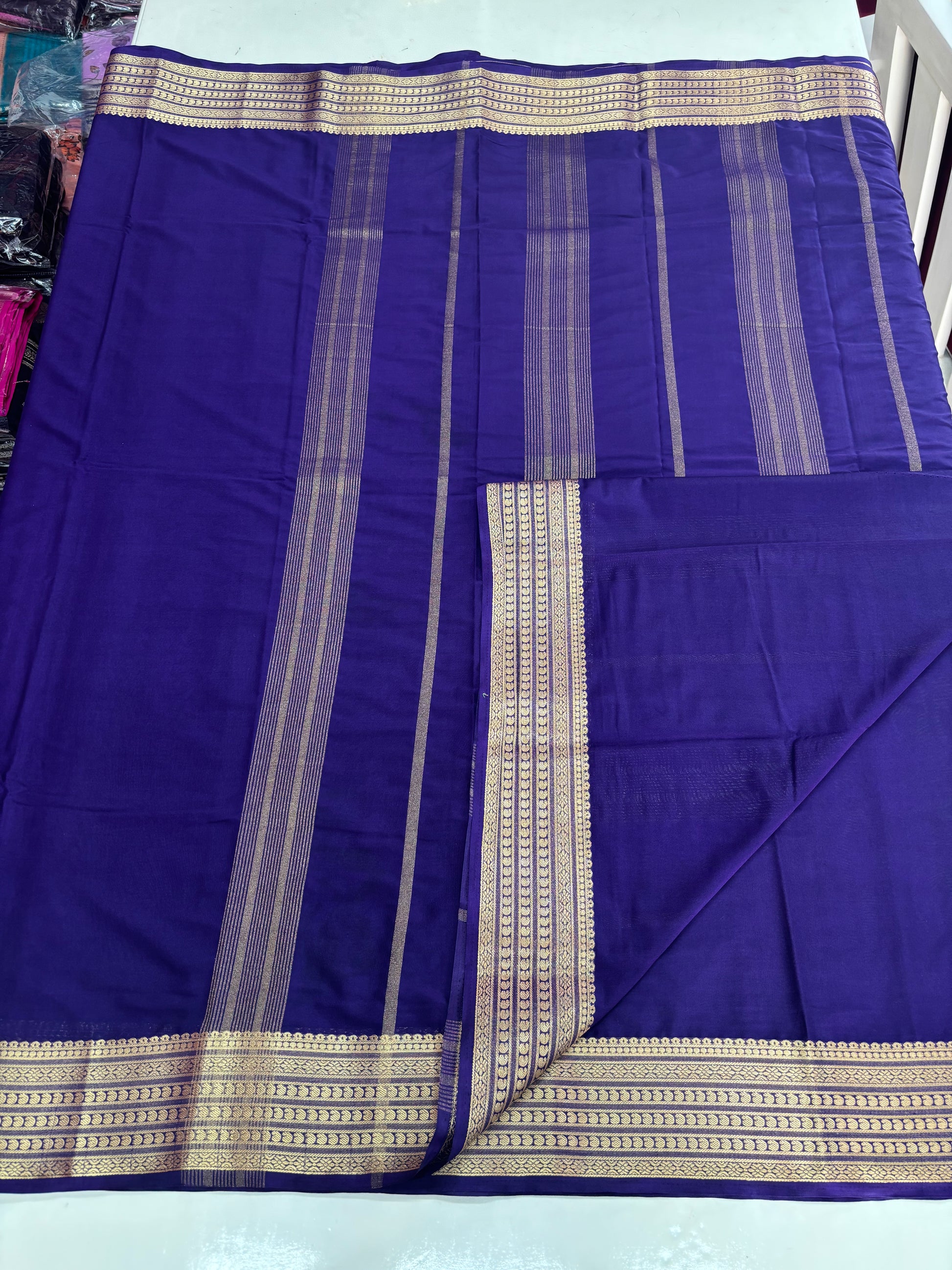 Product Description: Semi Mysore Crepe in self-colour with sequence mangoes border. The saree is available in beautiful colours. It has 4.5-inch stunning golden jari border and chit pallu.