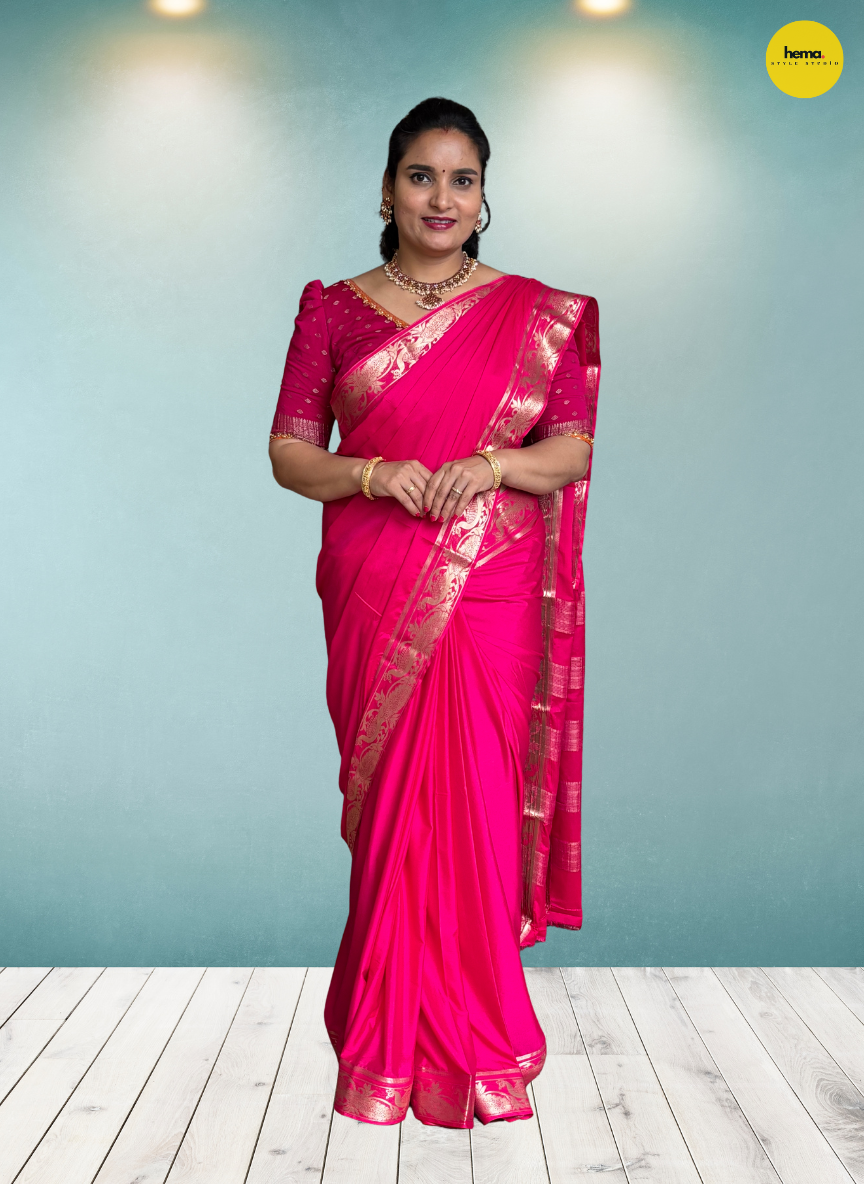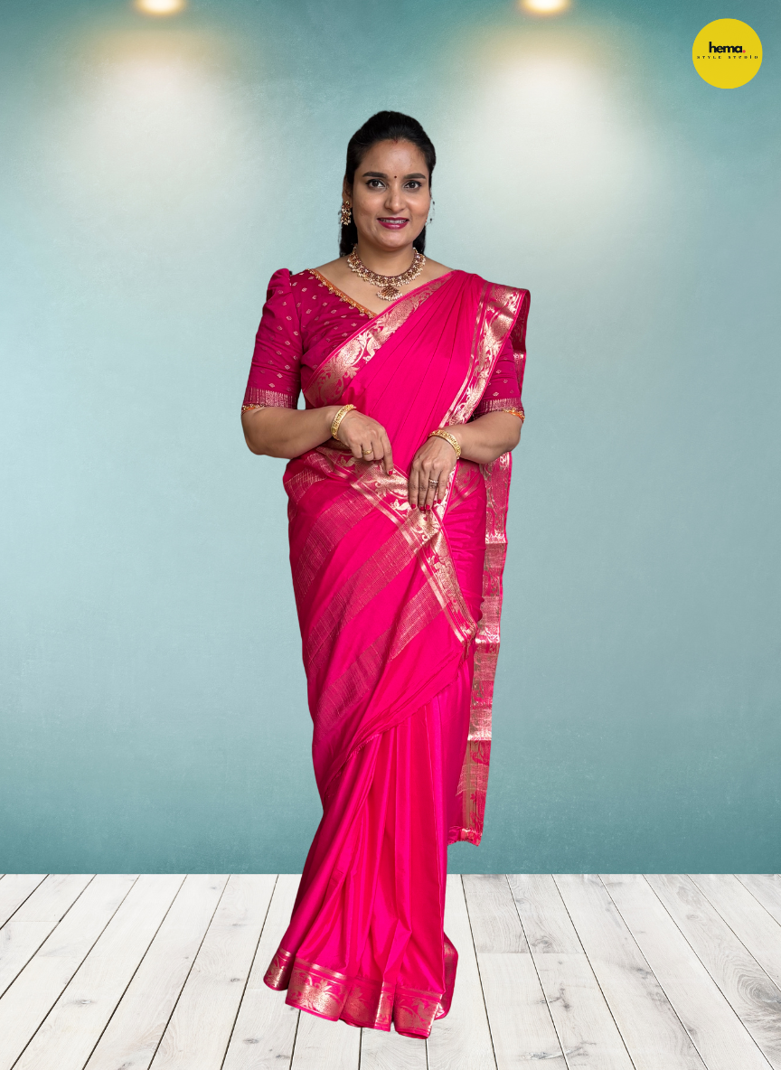 Product Description: This Semi Mysore Crepe featuring medium sized mayuri border is made of golden ivory zari. Made from premium crepe fabric, it offers a soft and luxurious feel to the touch.