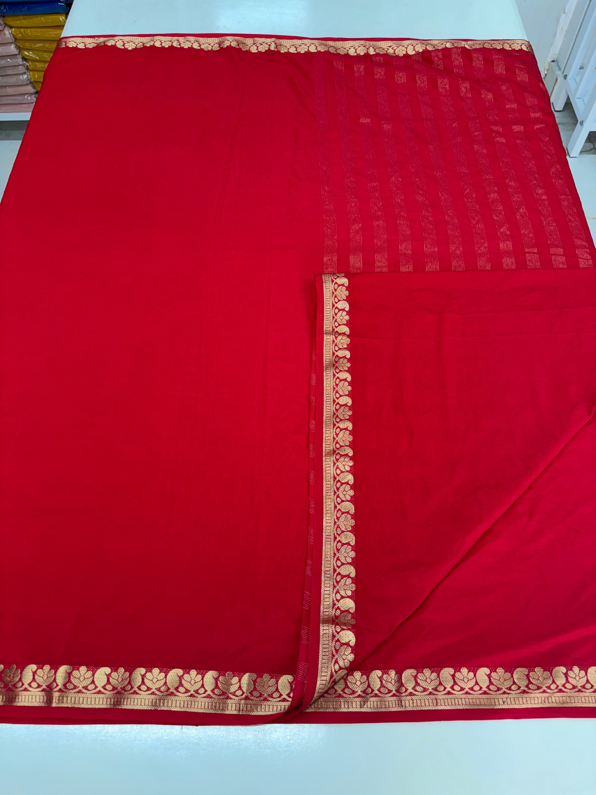 Product Description: Semi Mysore Crepe in trendy self-colors, featuring an elegant golden jari small mango and floral border with a chit pallu.