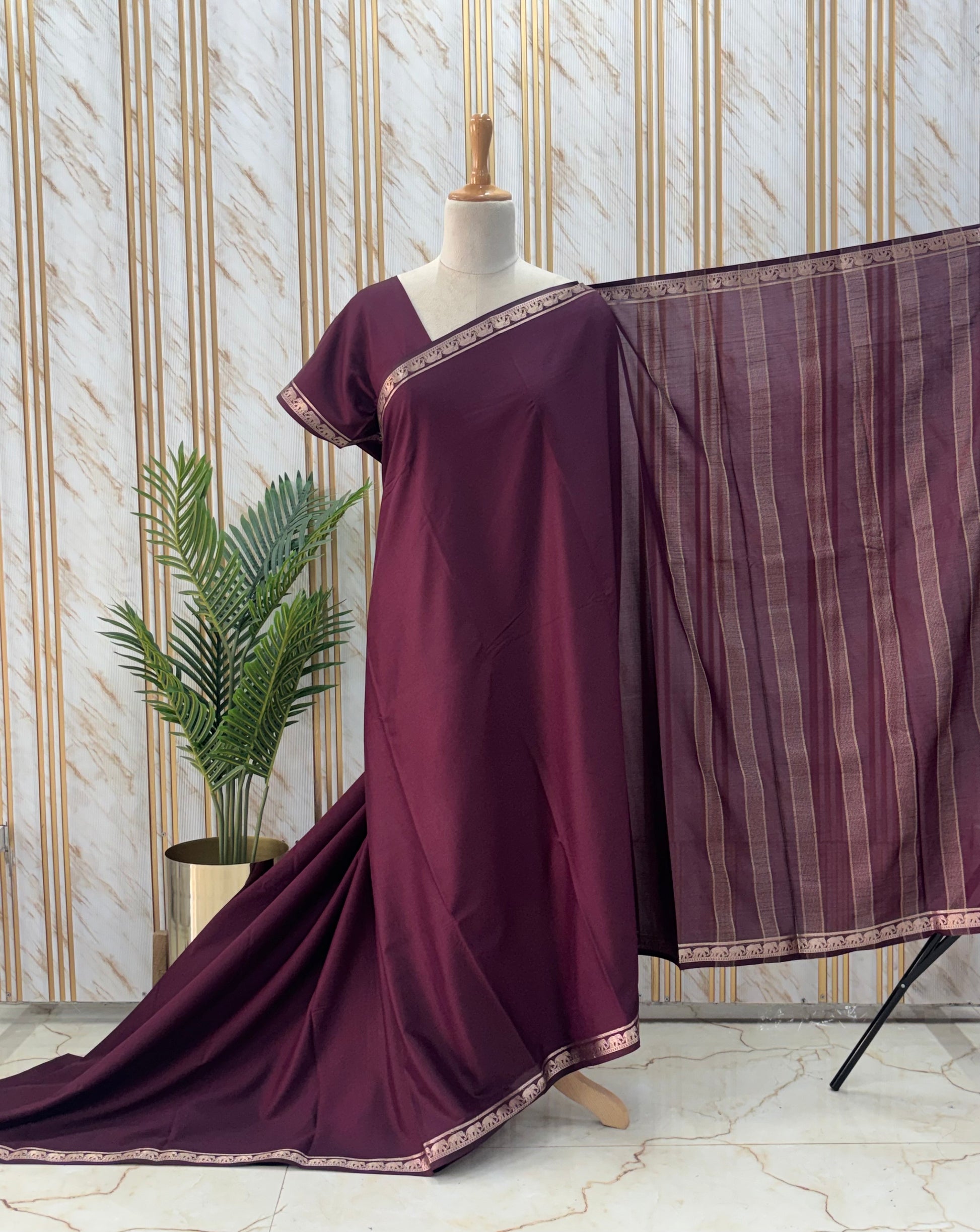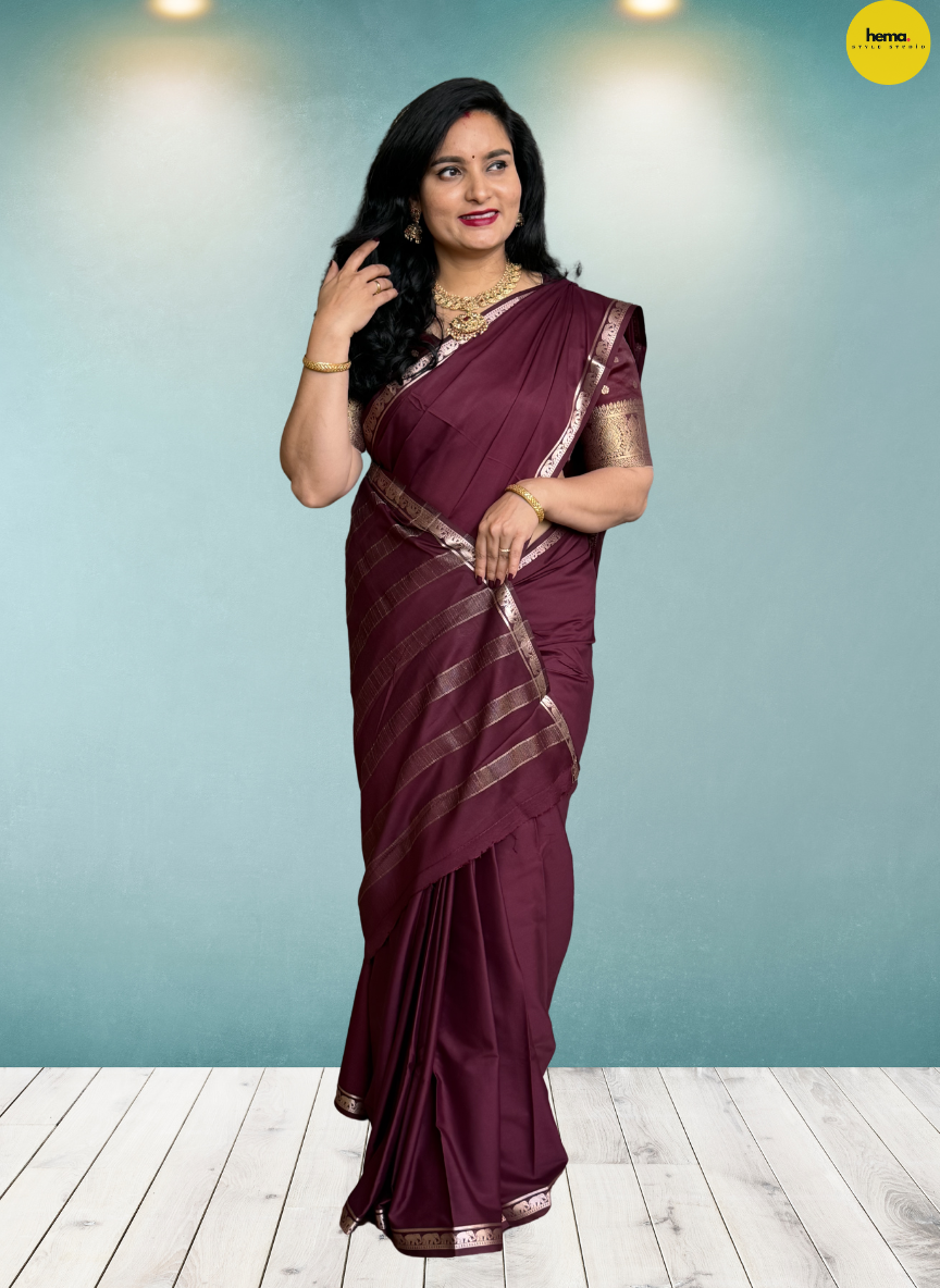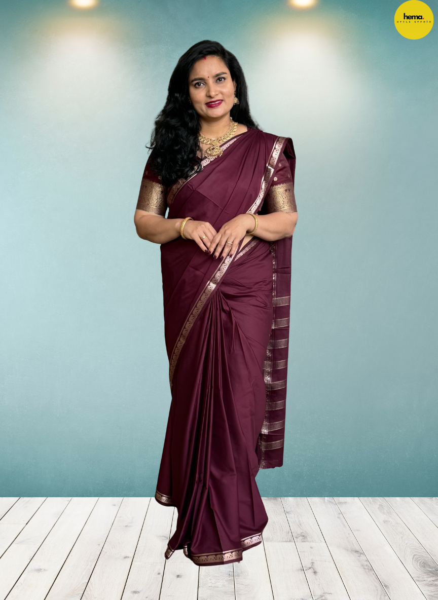 Product Description: Semi-Mysore crepe made from premium fabric, featuring trendy self-colors and a border of small marching elephants intricately woven with golden ivory zari.