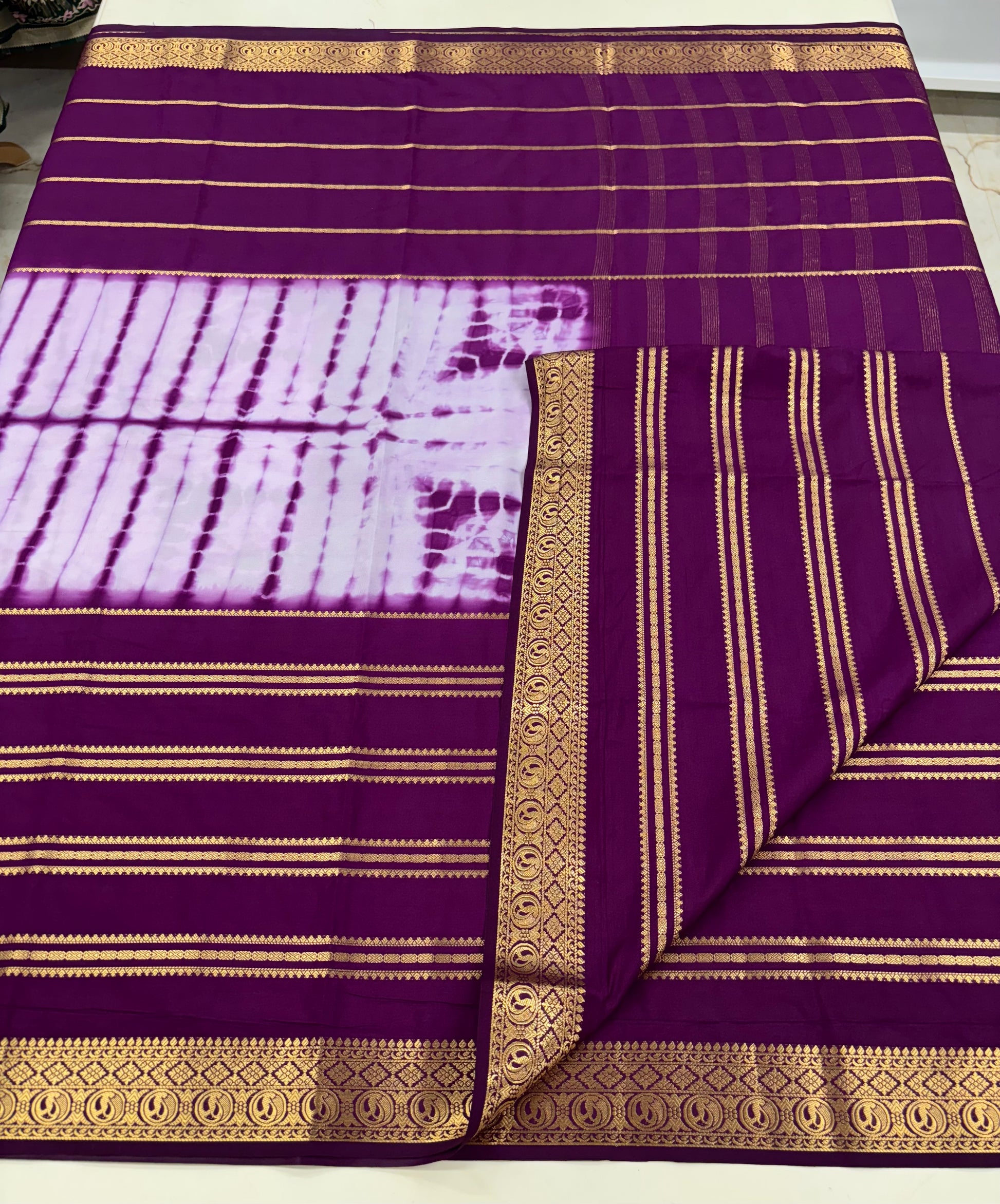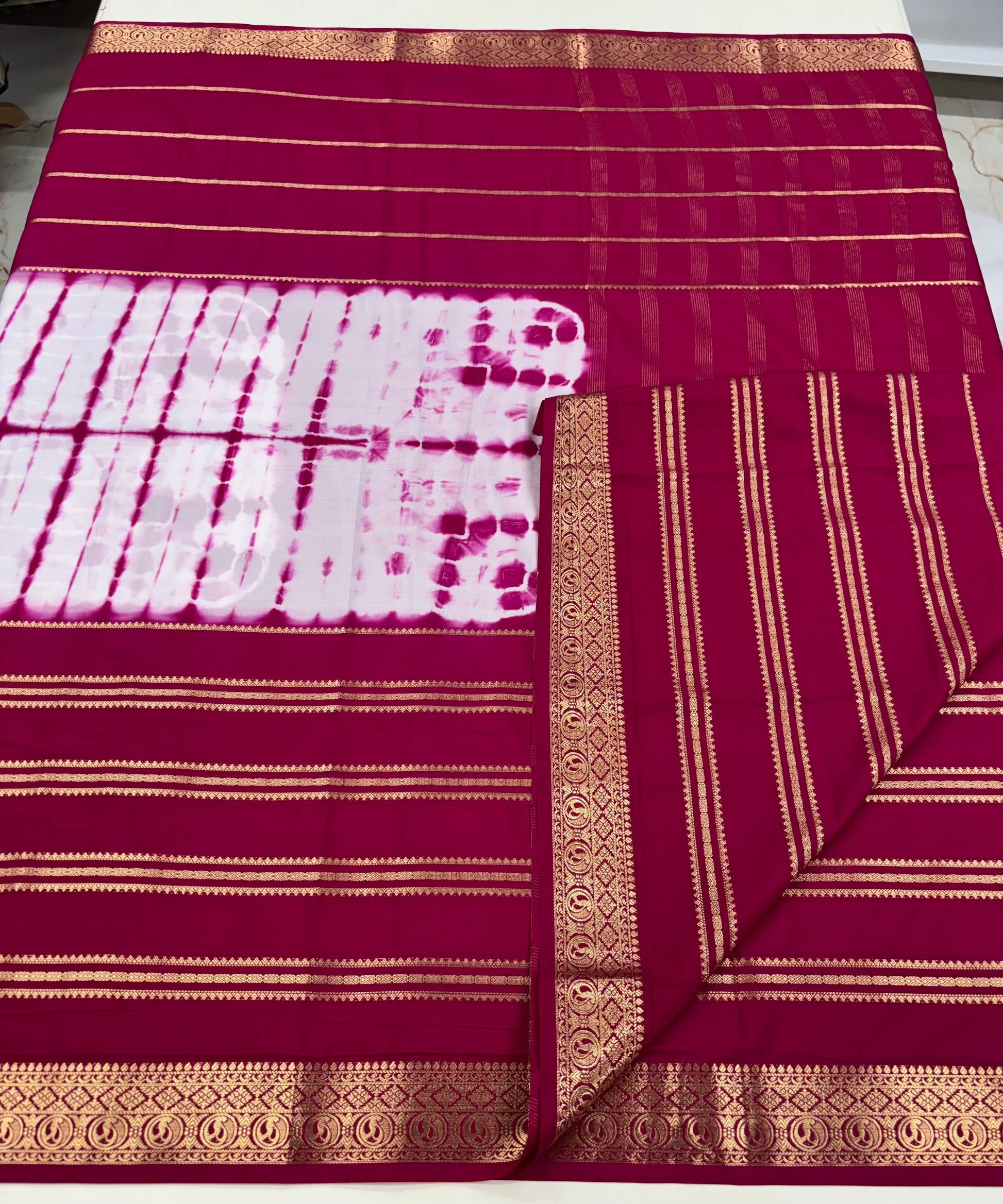 Product Description: Semi Mysore Crepe crafted in premium 2D crepe fabric features hand-dyed shibori patterns, creating unique designs. It features a Golden Zari Horizontal Lines Border and a stylish chit pallu for a touch of elegance, paired with a contrasting color blouse adorned with a matching border.