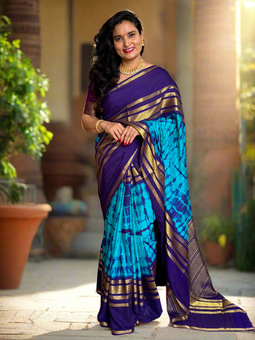 Product Description: Semi Mysore Crepe crafted from premium 2D crepe fabric, showcasing a hand-dyed shibori marble pattern elegantly spread across the saree, creating unique designs. It is enhanced with high-quality zari, a Big 4 Lines Border, and a stylish chit pallu.