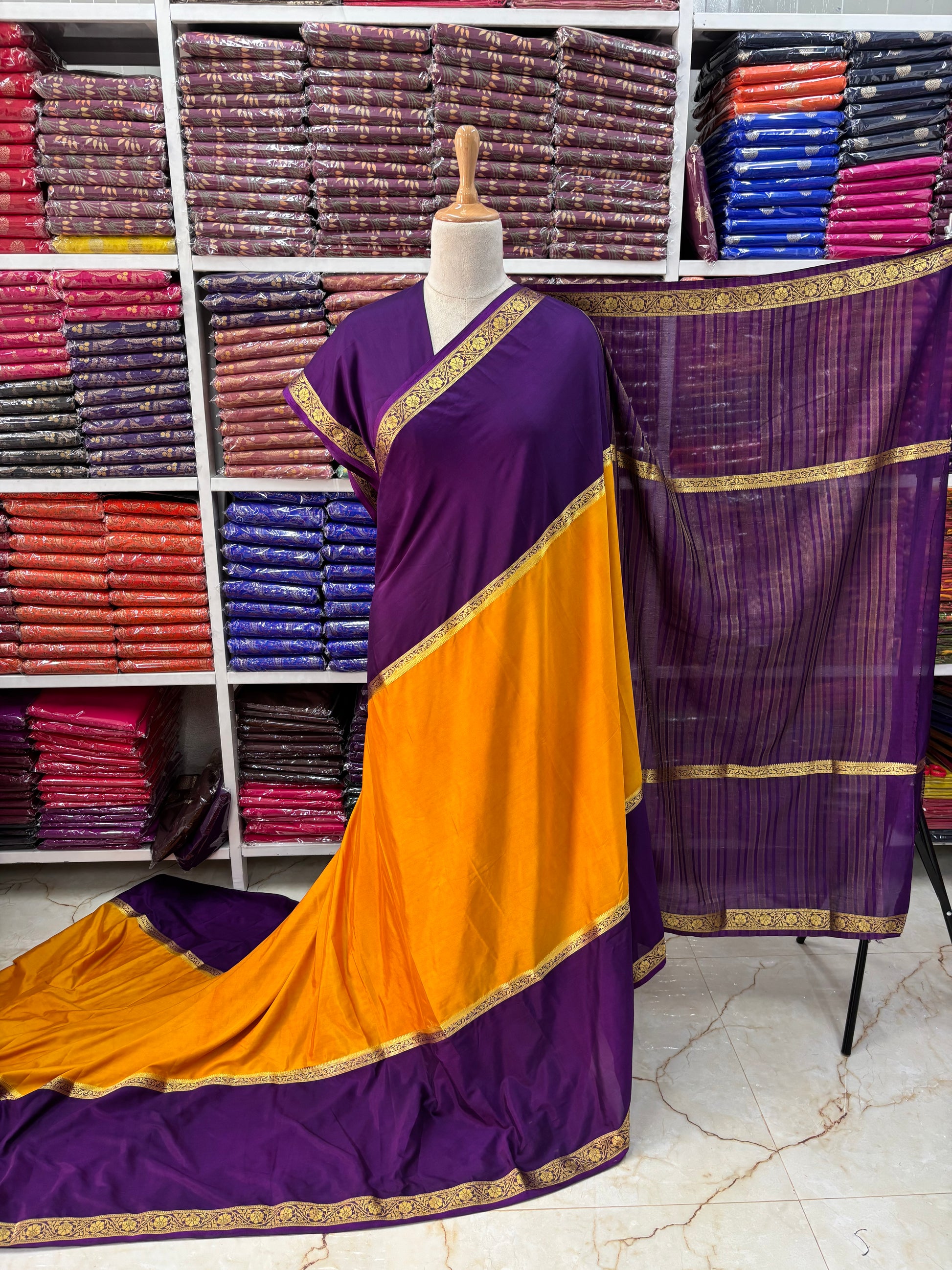 Product Description: Semi Mysore crepe made with premium fabric, showcasing a small border with Big Bentex and accented by a golden zari border.