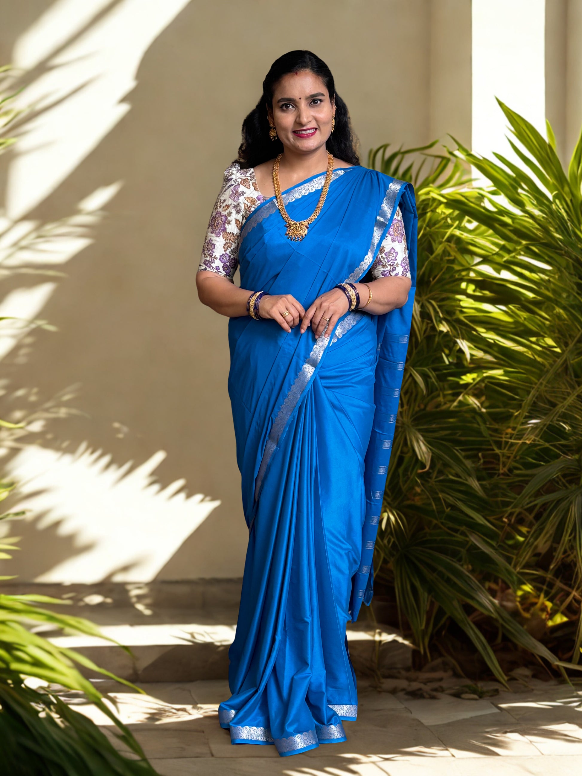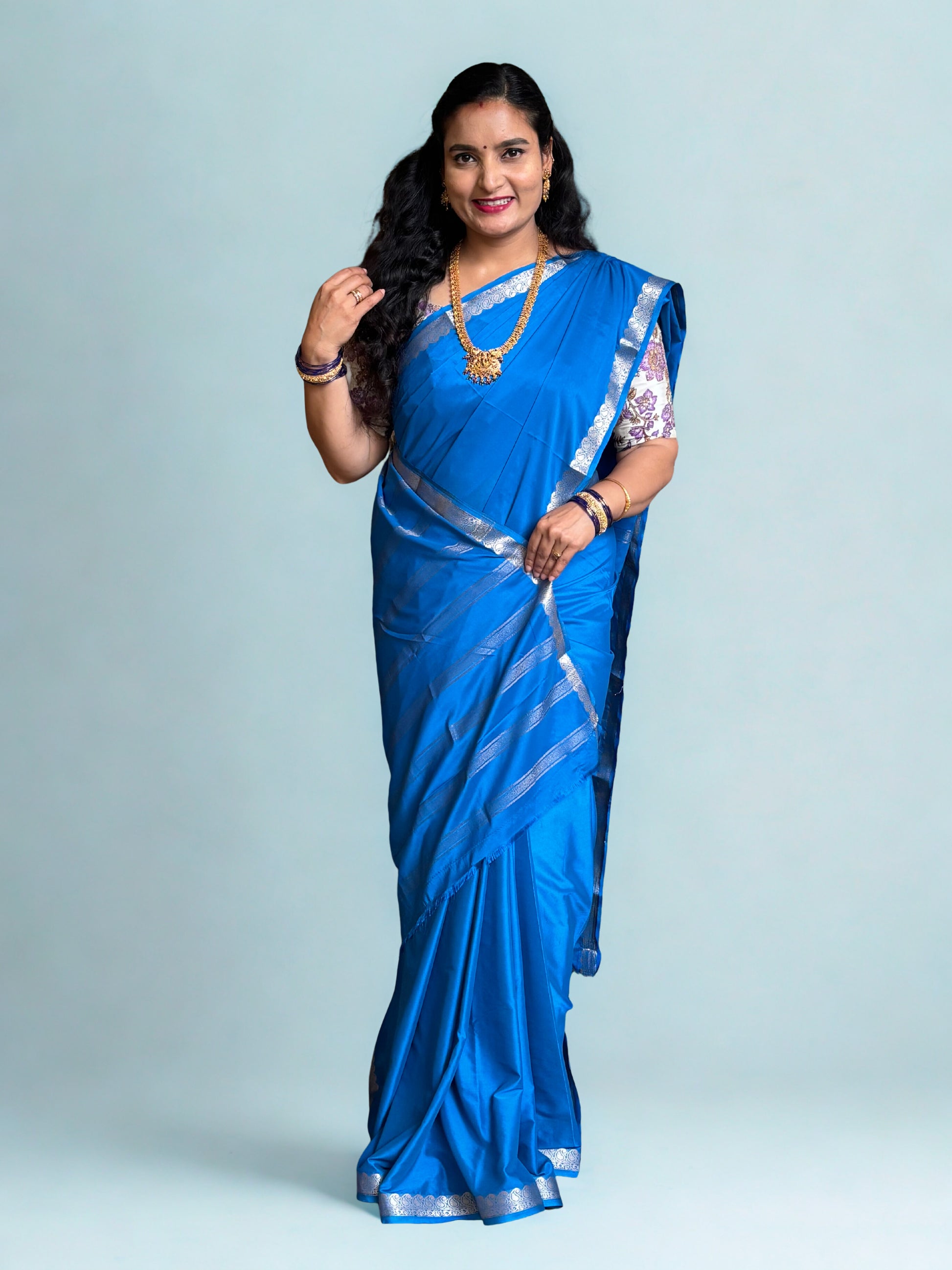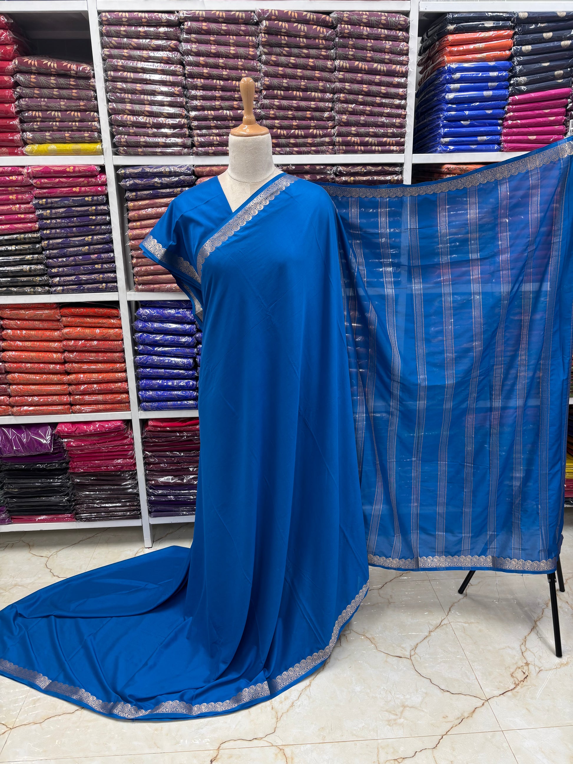 Product Description: Semi Mysore Crepe crafted from soft crepe fabric, featuring self plain body with golden invory zari woven mango border.