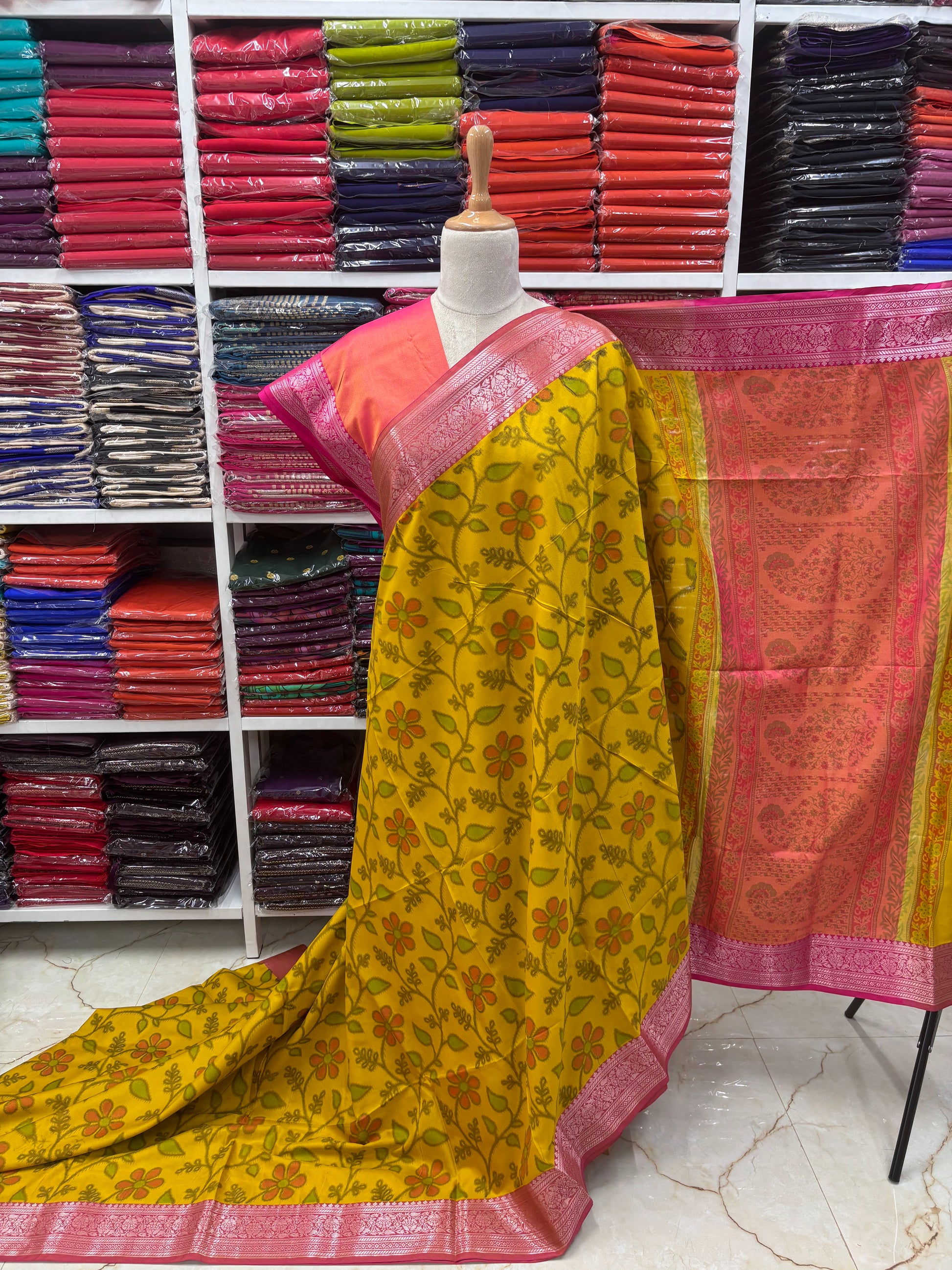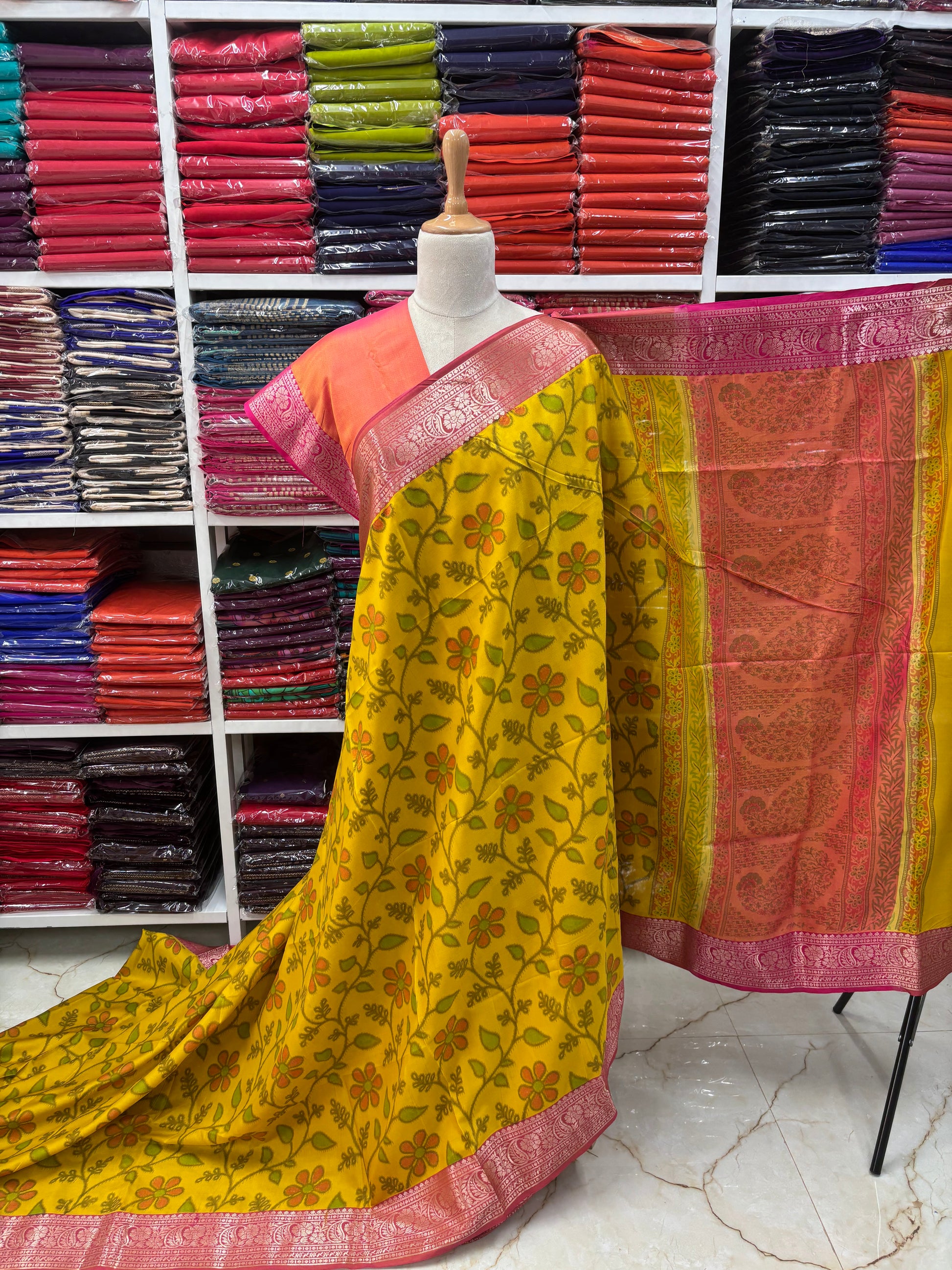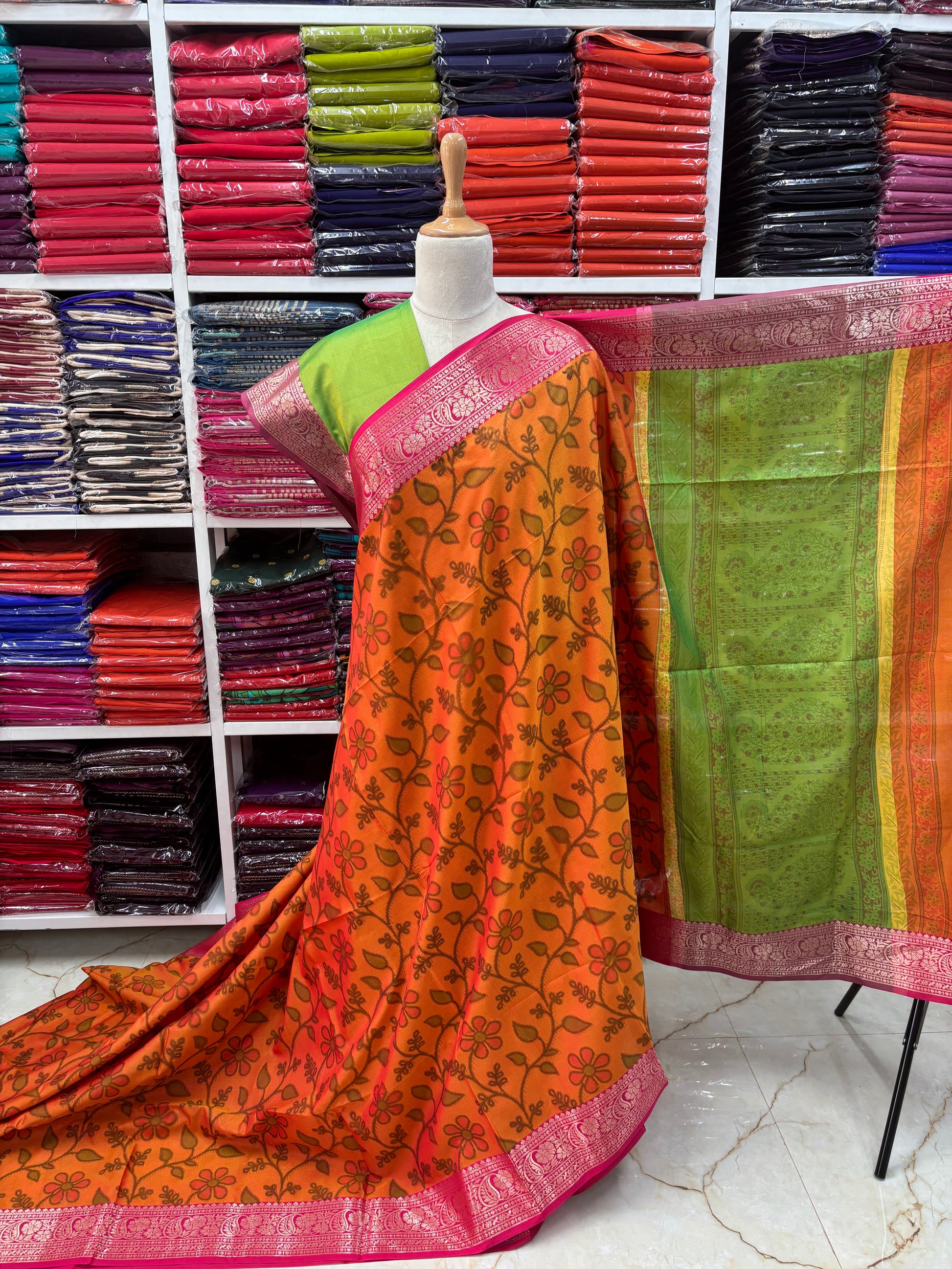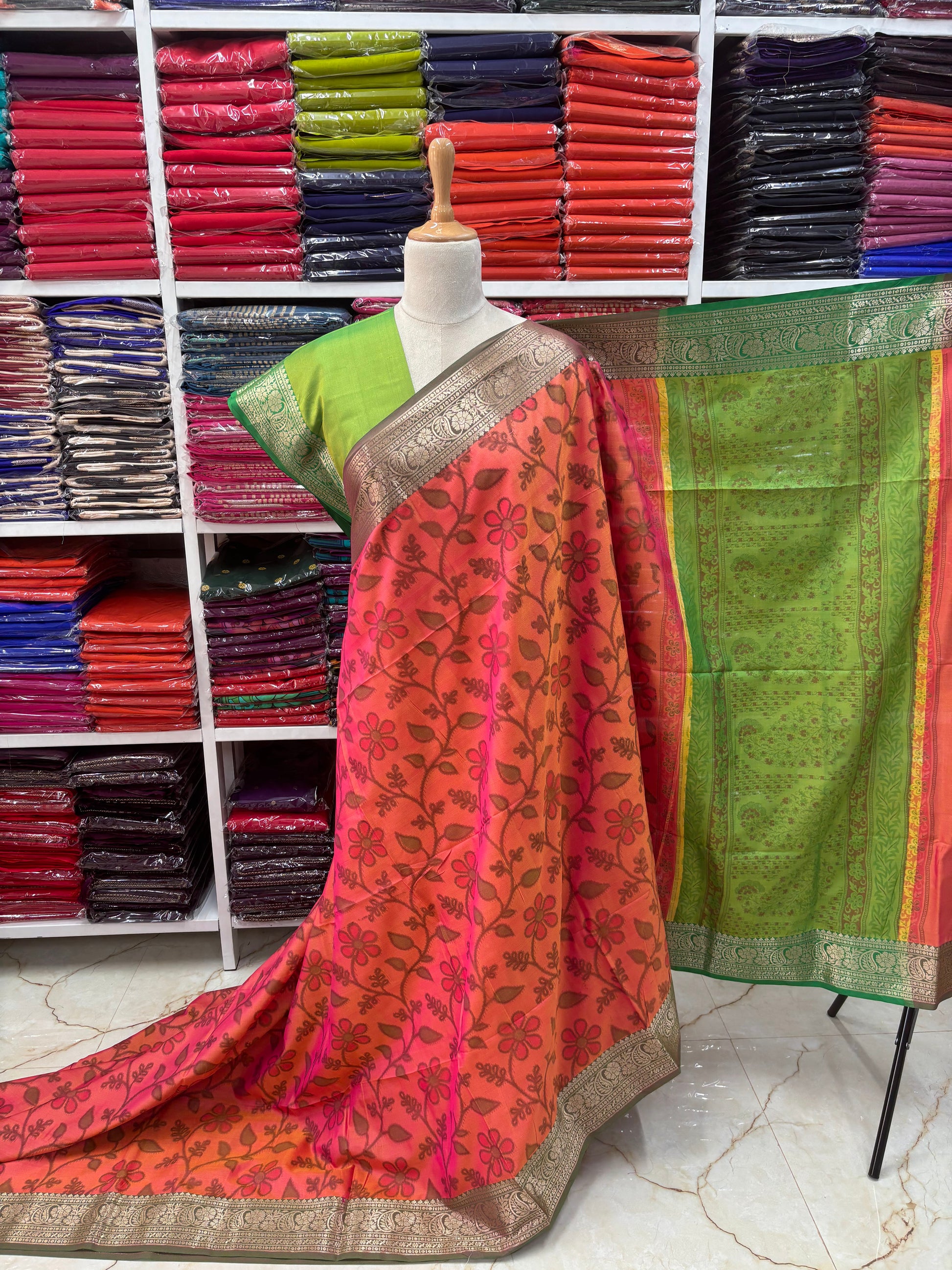 Product Description: This Semi Patola Saree featuring small sized Zari border on one side and big sized zari border on the other side. The body features Pochampally Ikkat design. It offers a soft and luxurious feel to the touch. These sarees are made in Banaras.