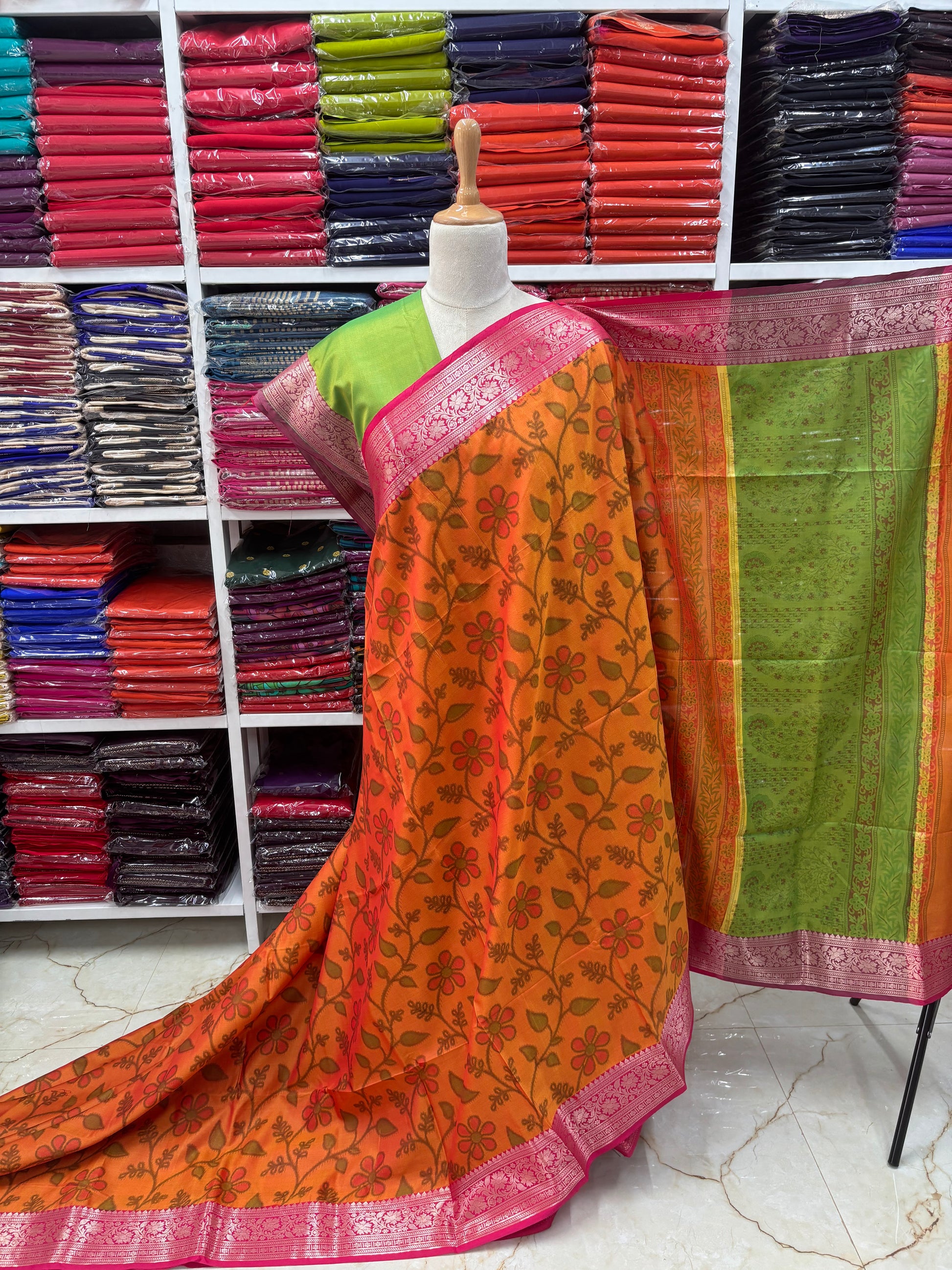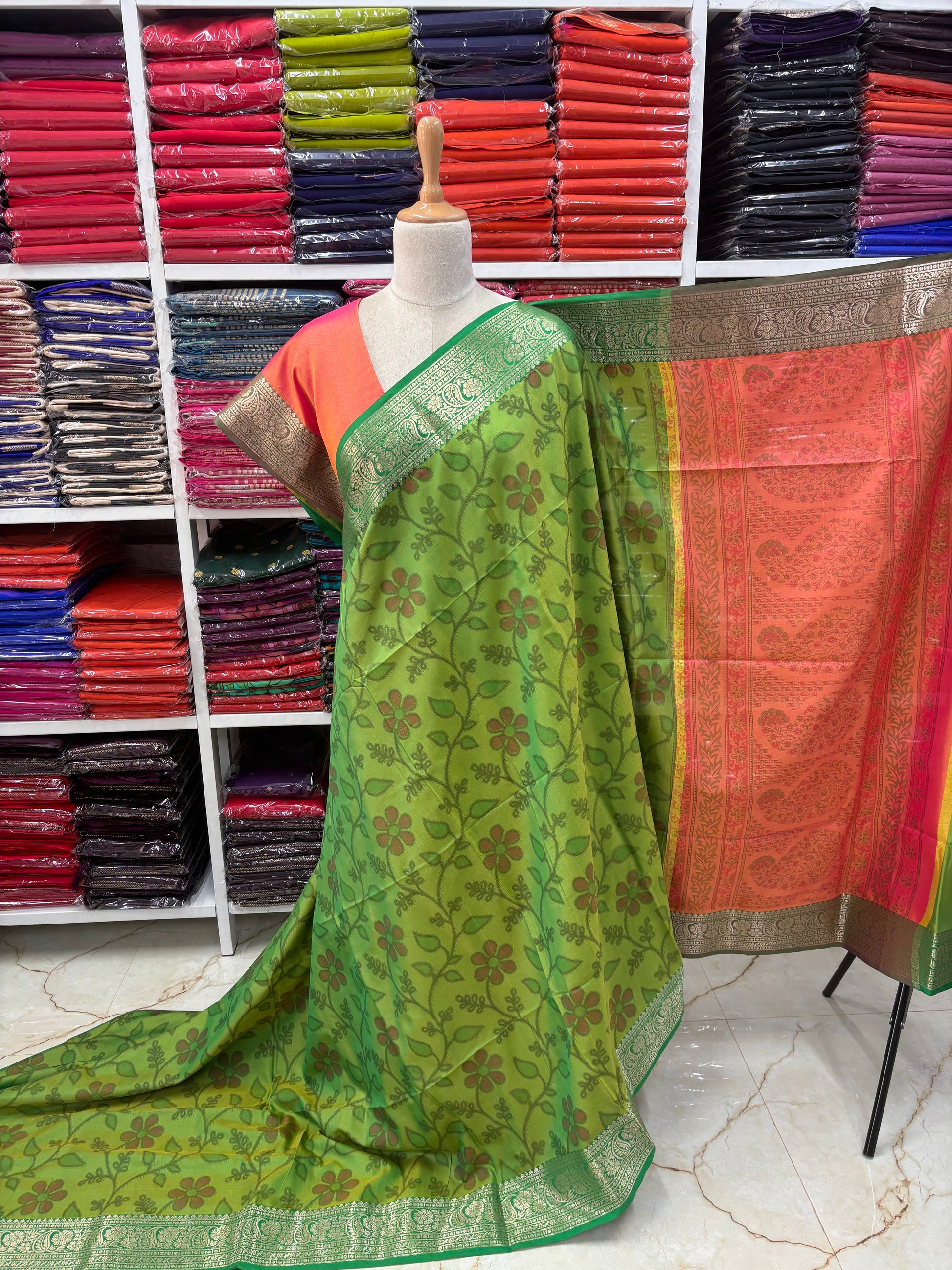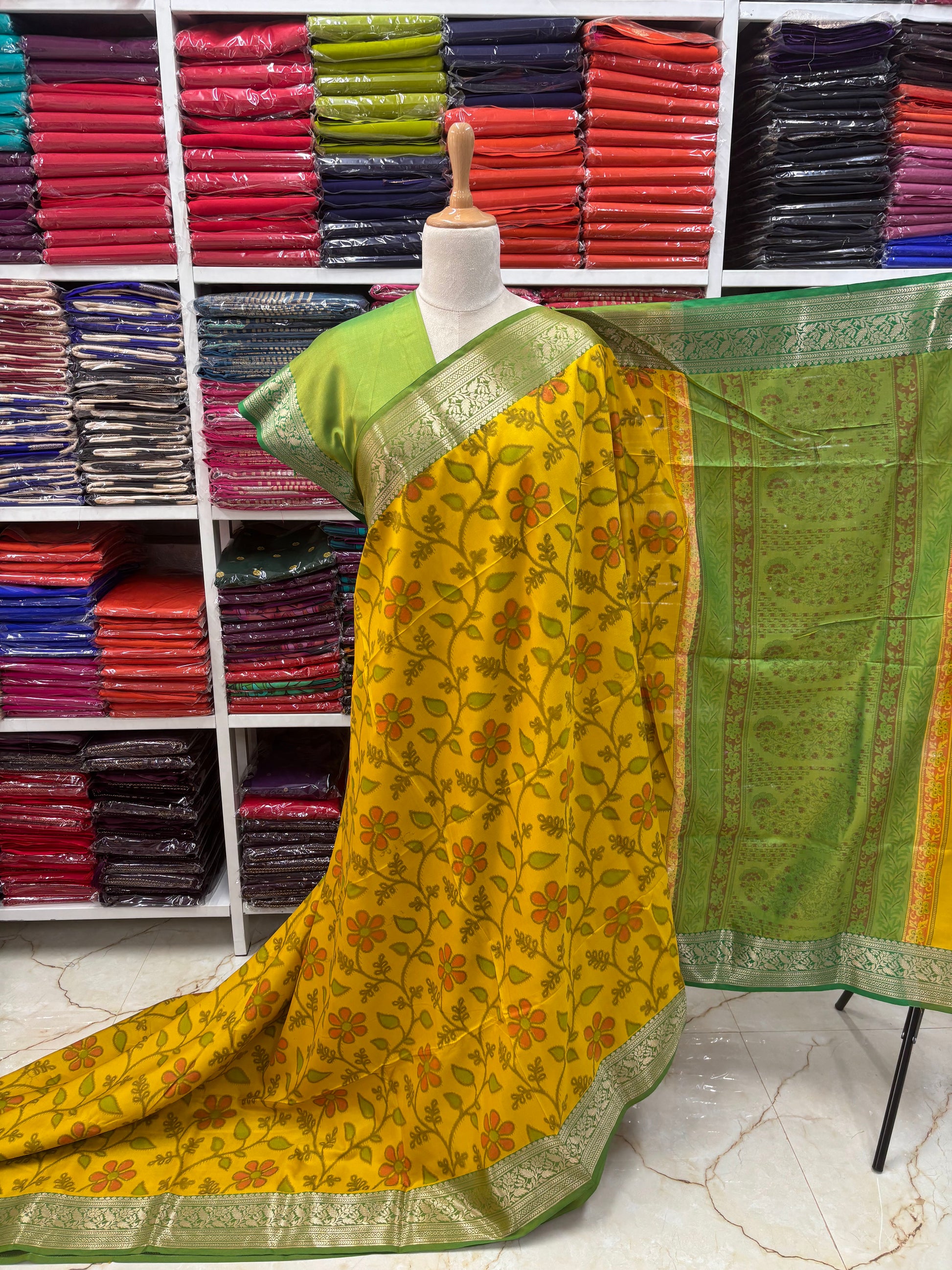 Product Description: This Semi Patola Saree featuring small sized Zari border on one side and big sized zari border on the other side. The body features Pochampally Ikkat design. It offers a soft and luxurious feel to the touch. These sarees are made in Banaras.