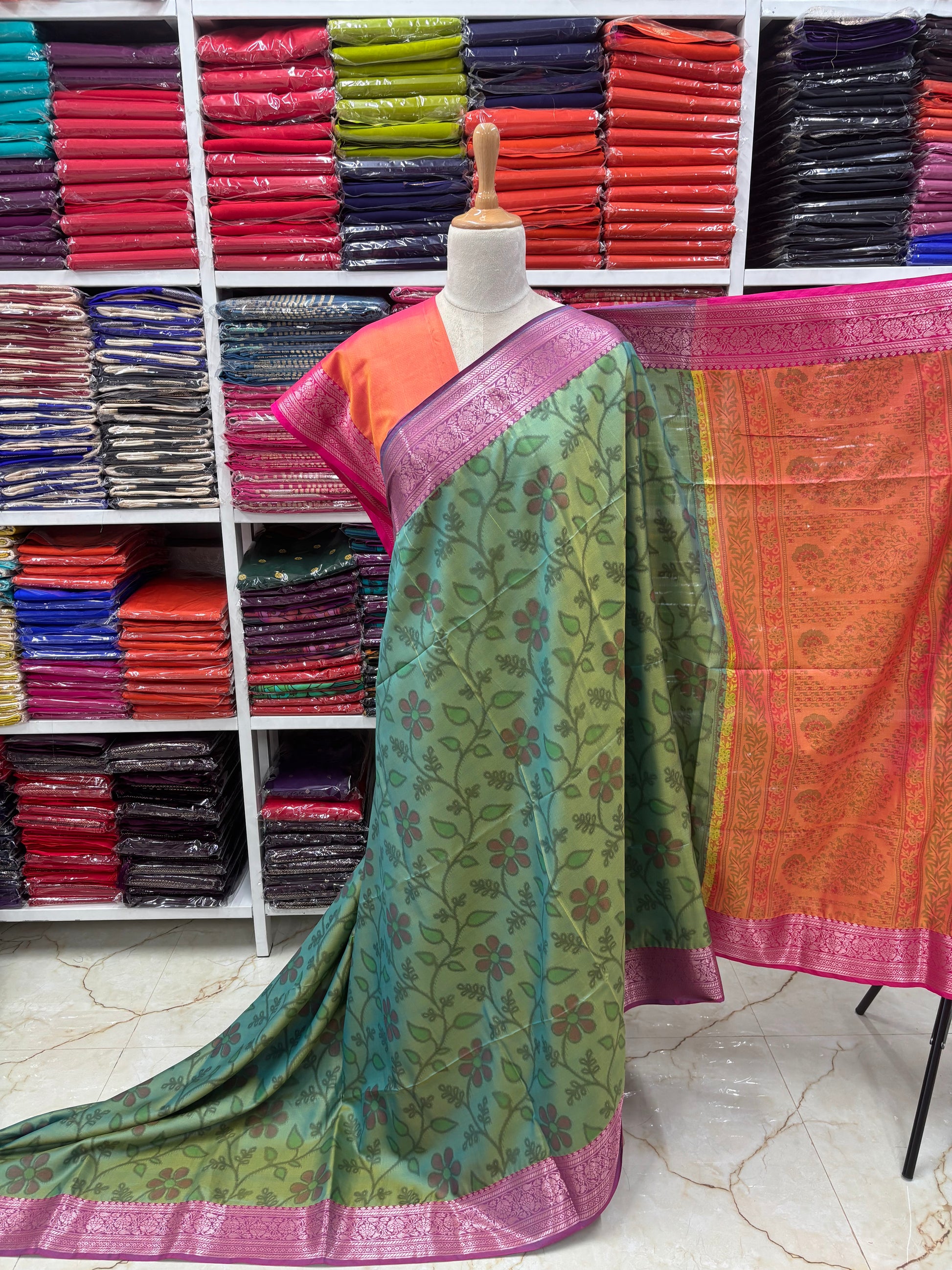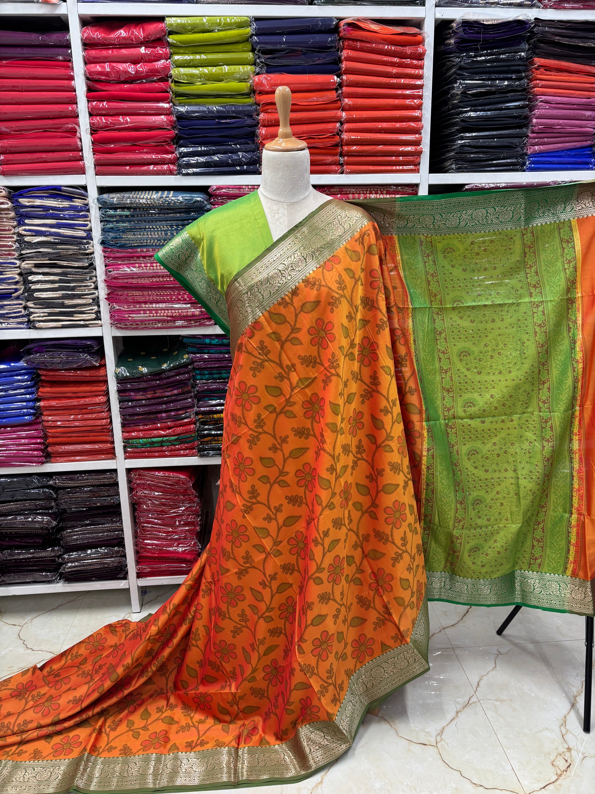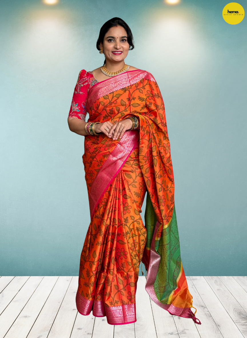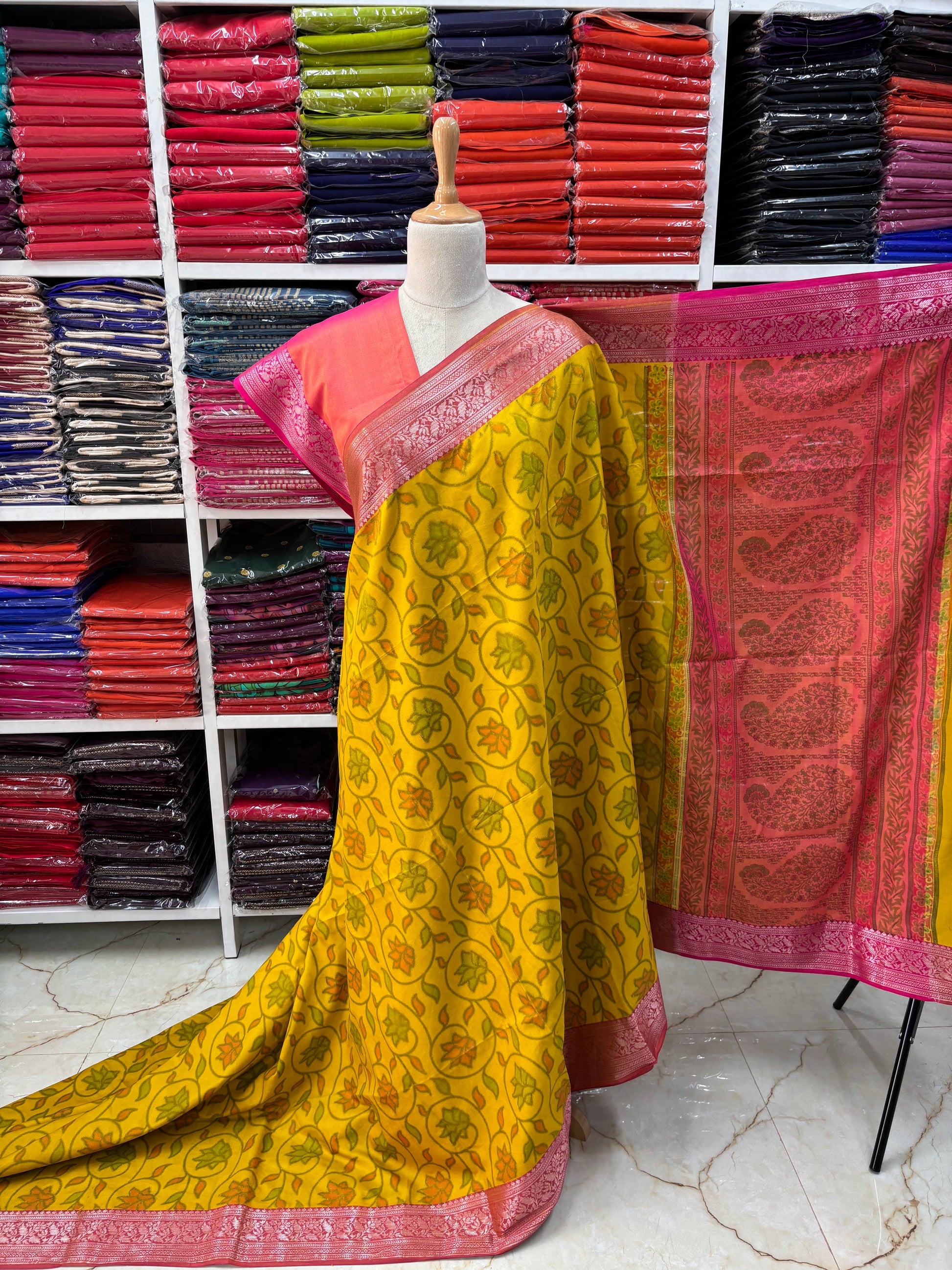 Product Description: This Semi Patola Saree featuring small sized Zari border on one side and big sized zari border on the other side. The body features Pochampally Ikkat design. It offers a soft and luxurious feel to the touch. These sarees are made in Banaras.